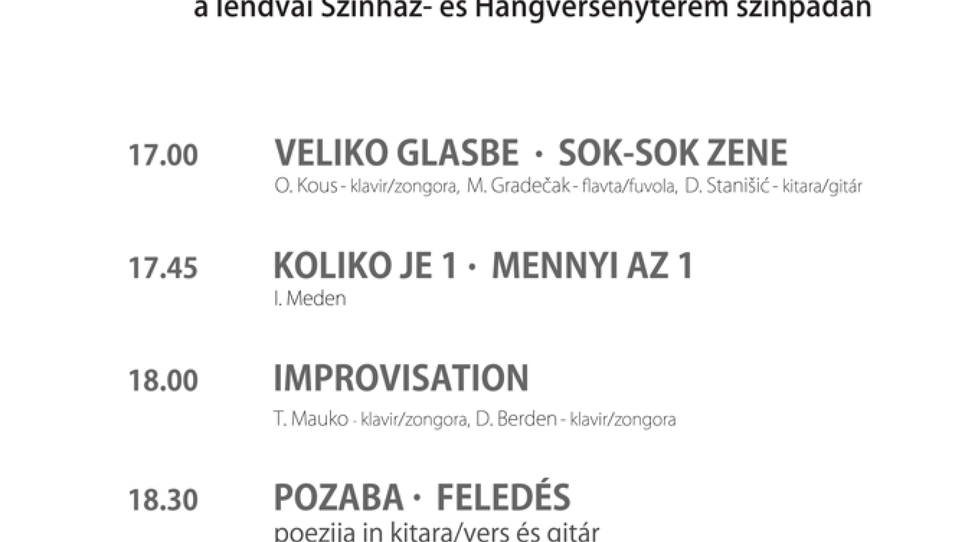 Sodelujejo: Olga Kous (klavir), Melanija Gradečak (flavta), Damjan Stanišič (kitara), Dejan Berden (klavir), Štefan Kardoš (pesnik in pisatelj), Ignac Meden (ak. slikar), Janko Rožič (arhitekt in esejist), Gabriella Gaál (prevajalka)