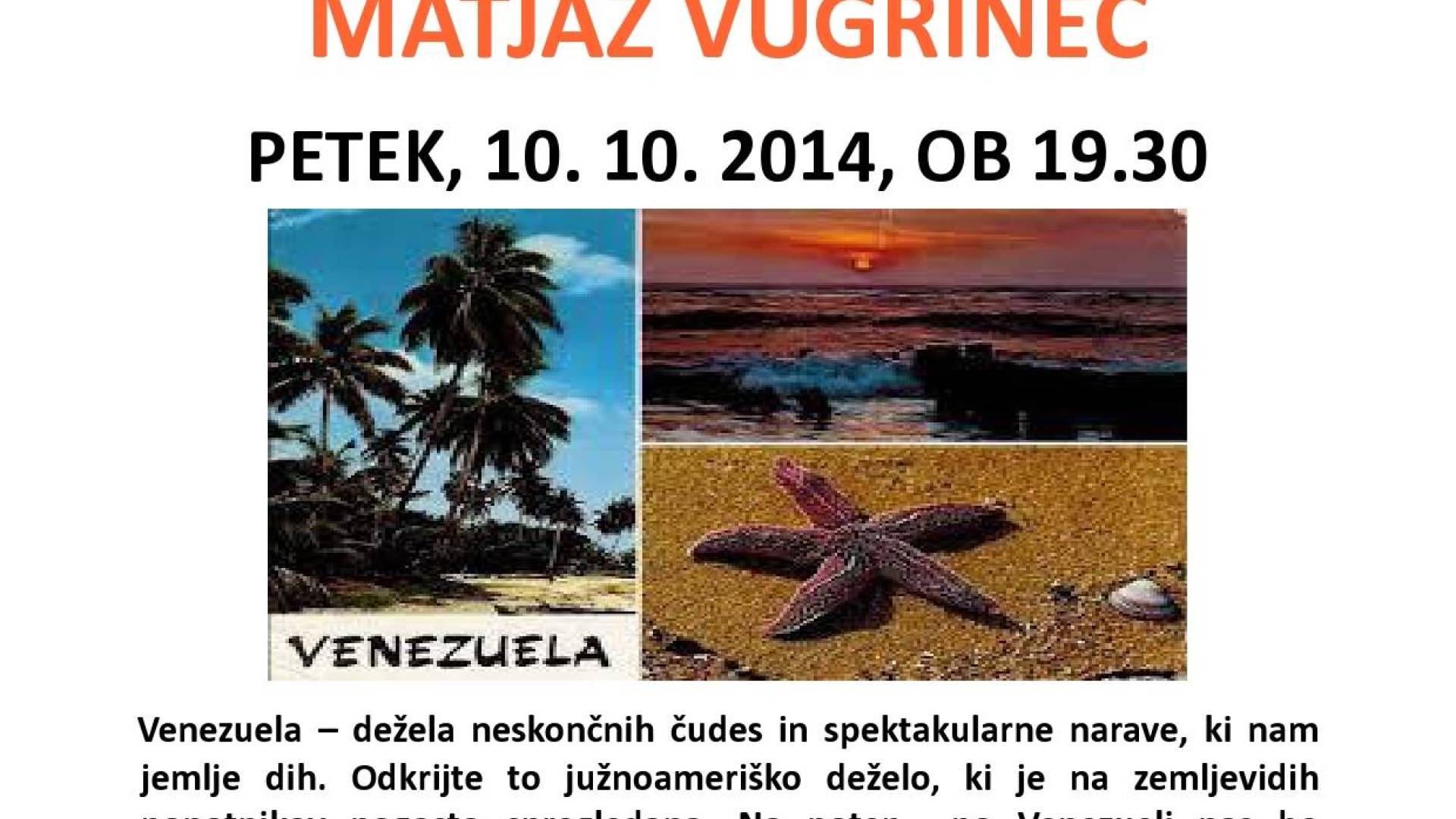 Sofija medgeneracijska hiša Lendava Glavna ulica 48 9220 LendavaVenezuela – dežela neskončnih čudes in spektakularne narave, ki nam jemlje dih. Odkrijte to južnoameriško deželo, ki je na zemljevidih popotnikov pogosto spregledana. Na potep po Venezueli nas bo popeljal Matjaž Vugrinec, ki bo z nami delil zanimiva doživetja in najatraktivnejše utrinke s svojega potovanja.