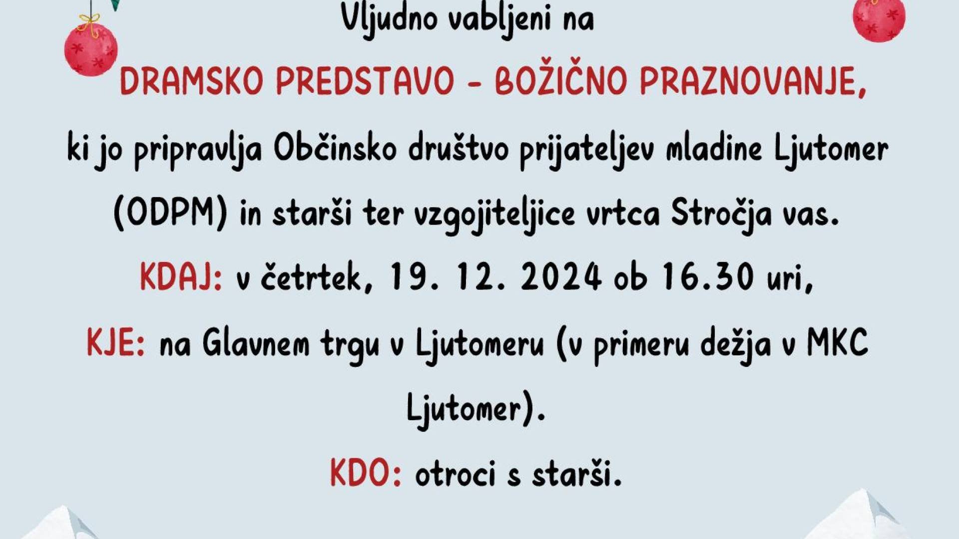 Glavni trg LjutomerDramska predstava Božično praznovanje v izvedbi Občinsko društvo prijateljev mladine Ljutomer ter starši in vzgojiteljice vrtca Stročja vas.