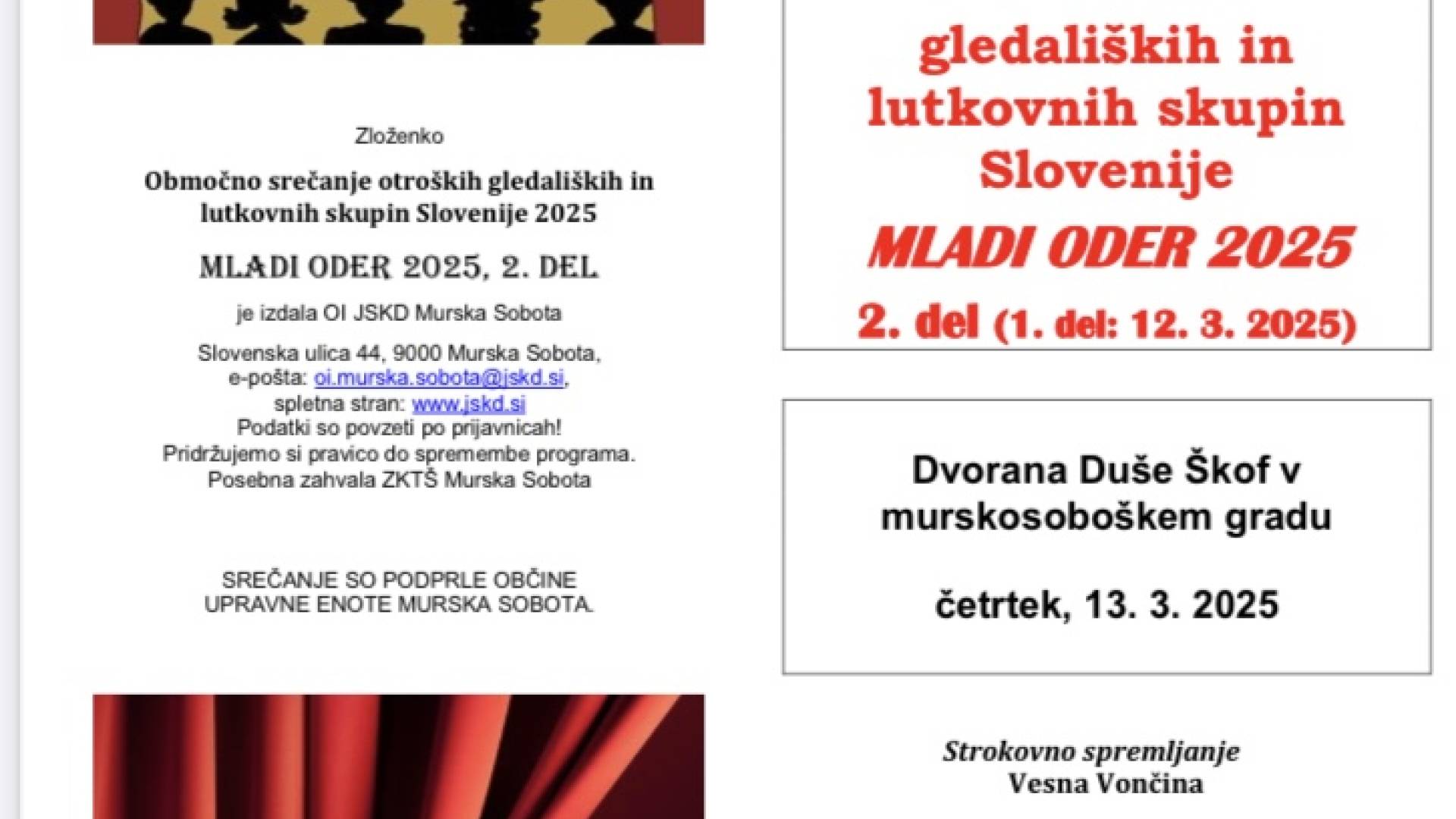 Dvorana Duše Škof - Grad Murska SobotaMladi oder 2025: Območno srečanje otroških gledaliških in lutkovnih skupin.