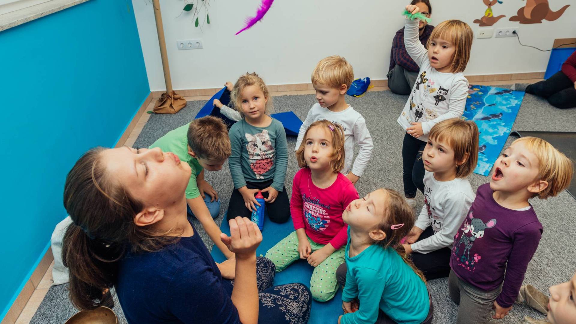 Pravljična joga je namenjena otrokom od 2,5 let naprej. Otroci vadijo skupaj z mamicami, očki, babicami, tetami,,....