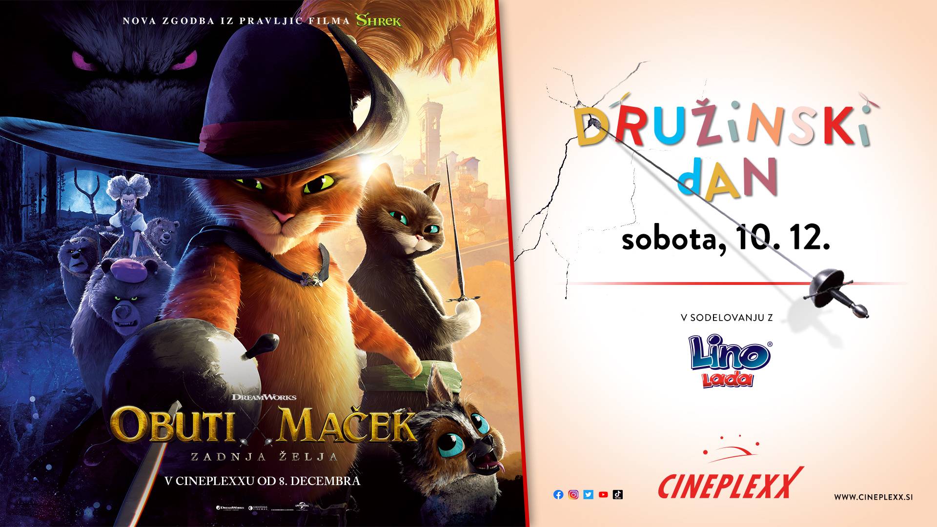 V kinu Cineplexx (Maximus) v Murski SobotiNa velika platna se vrača vsem najljubši, ljubeči, romantičen in neustrašen maček. Družinski dan Obuti maček: Zadnja želja bo v soboto, 10. decembra v Cineplexxu Murska Sobota. Super pobarvanke v otroškem kotičku, najmlajše pa bo razvesila tudi Linolada.
