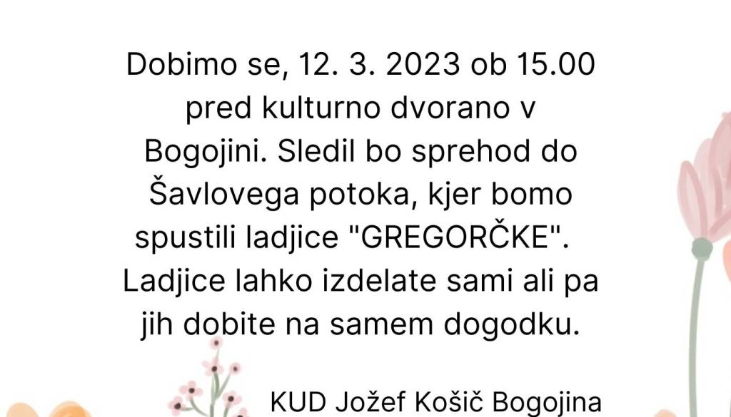 Družinski potep na Gregorjevo Jana Bohar | 8. marec 2023 09:16 v Termin Nedelja, 12. marec 2023 15:00 Lokacija Bogojina - kulturna dvorana Pridružite se nam na potepu!