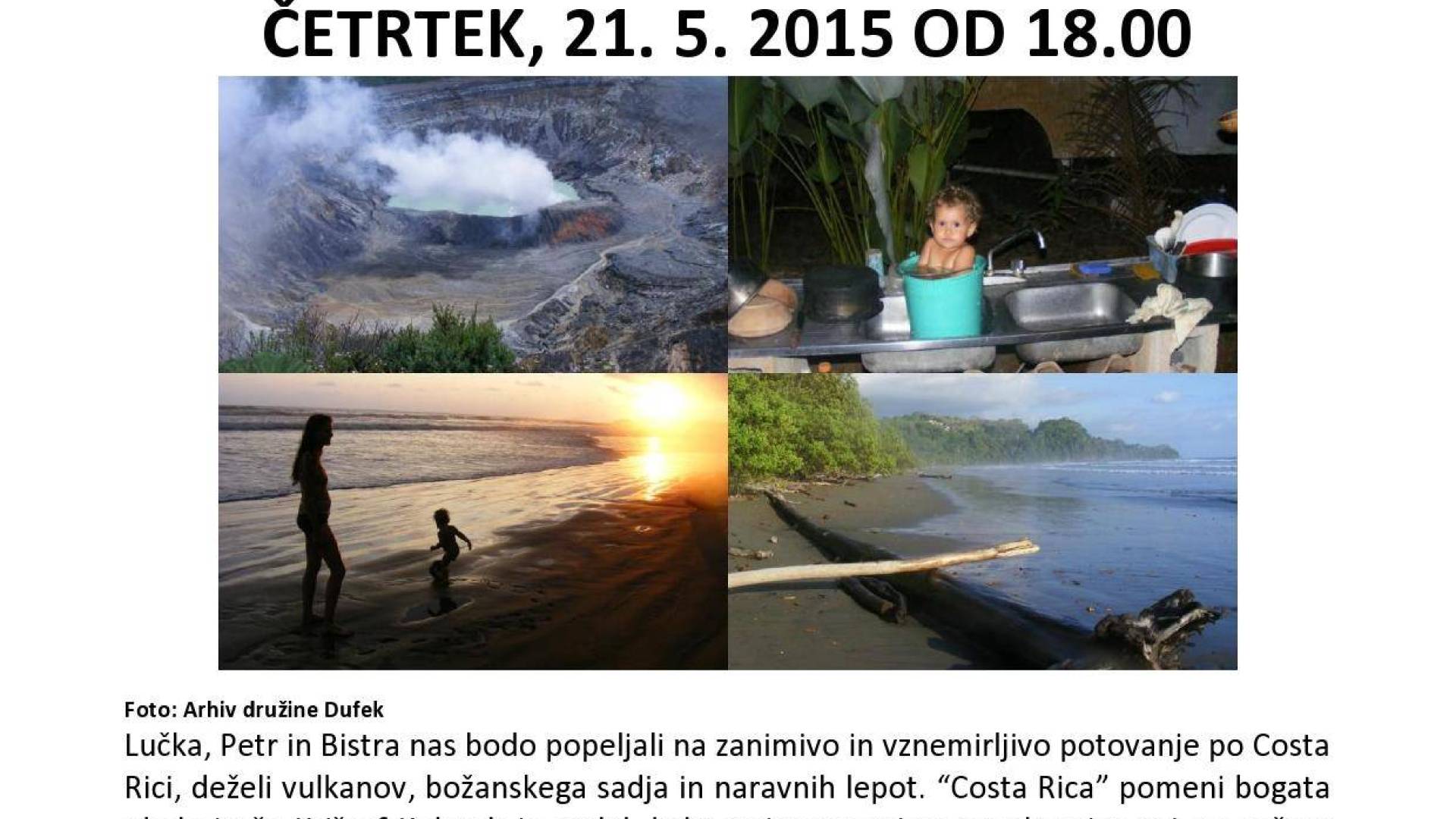 Sofija medgeneracijska hiša Lendava Glavna ulica 48 9220 LendavaLučka, Petr in Bistra nas bodo popeljali na zanimivo in vznemirljivo potovanje po Costa Rici, deželi vulkanov, božanskega sadja in naravnih lepot. “Costa Rica” pomeni bogata obala in že Krištof Kolumb je vedel, kako poimenovati ta neoskrunjen raj na našem planetu, kjer se prepletajo različne pokrajine, mikroklime, čudovita flora in favna,... V to eksotično deželo sta se Lučka in Petr odpravila s takrat eno in pol leto staro hčerkico Bistro. Predstavila nam bosta, kaj pomeni 3 mesece potovati z otrokom skoraj brez denarja po neoskrunjenem raju. Pridružite se nam na predavanju in pokukajte v to čudovito Srednje Ameriško državo, ki ima najbolj cvetoč eko-turizem na svetu, nima vojske in nam je lahko vsem v navdih …