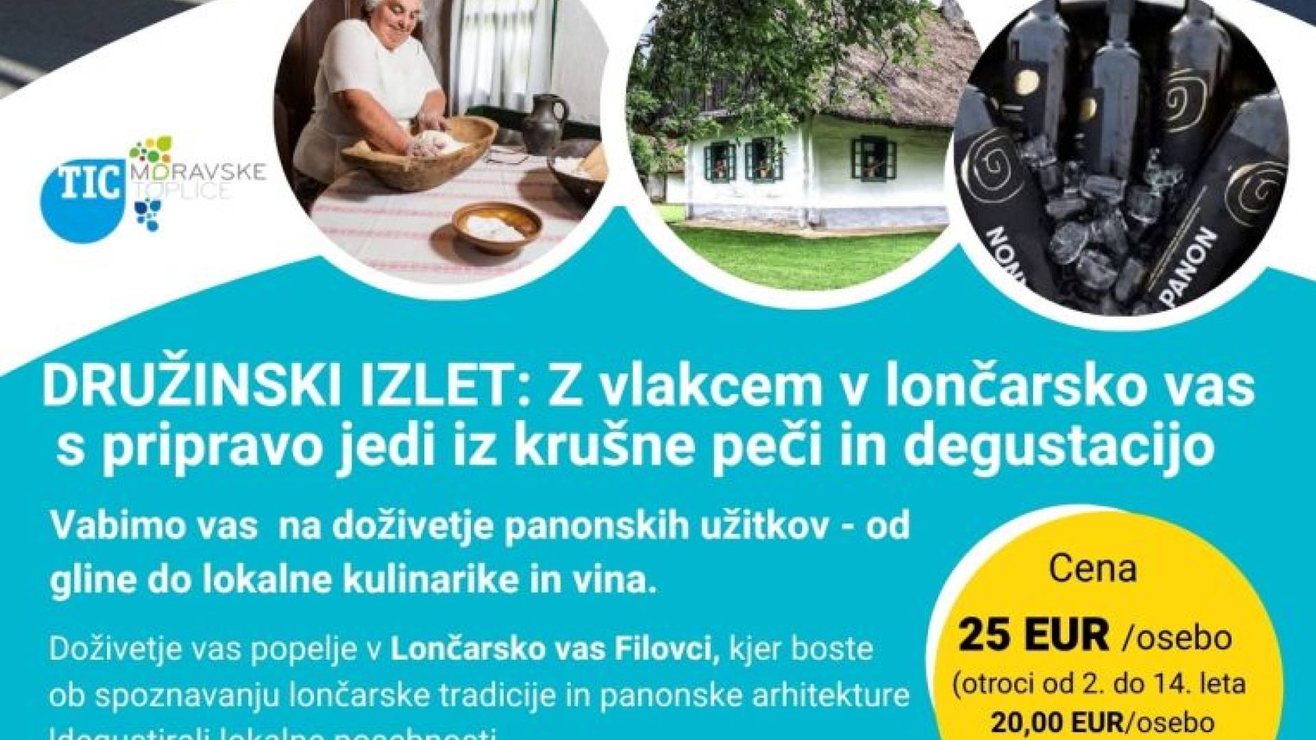 Starši z otroki ali stari starši z vnuki se lahko pridružite izletu s poudarkom na dediščini in kulinariki, ki ga prirejamo za družine v krompirjevih počitnicah. Z vlakom se boste zapeljali v lončarsko vas Filovci, kjer boste sodelovali v kulinarični delavnici peke plemenjaka v krušni peči, nato pa dobrote iz krušne peči tudi pokusili, odrasli ob spremljavi sonaravnega vina in mošta, otroci ob spremljavi grozdnega soka. Na voljo bo tudi prikaz lončarjenja in ogled cimprač. Cena 25 eur za otroke in 20 eur za odrasle. Rezervacije in prijave na izlet zbiramo en dan pred izvedbo izleta v TIC Moravske Toplice.