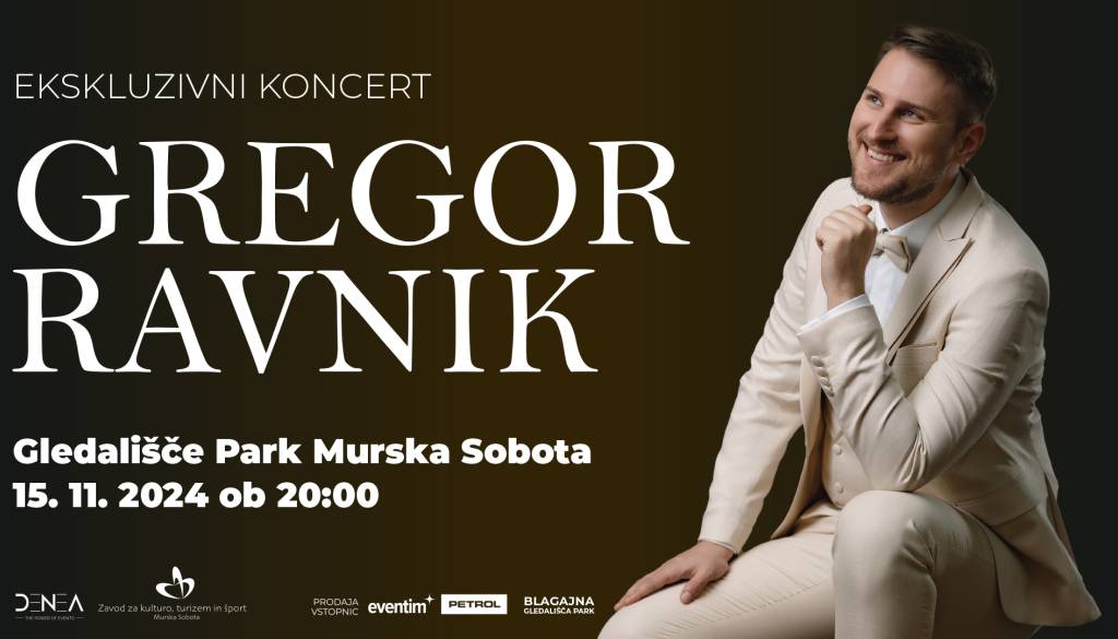 Gledališče Park Murska SobotaVabljeni v Gledališče Park na veliki ekskluzivni koncert izjemnega primorskega glasbenika Gregorja Ravnika. Gregor vas bo s spremljevalno skupino popeljal skozi čustveno in energično doživetje. To bo večer poln glasbenih presenečenj – poleg avtorskih skladb bomo lahko slišali tudi izbrane največje slovenske uspešnice.