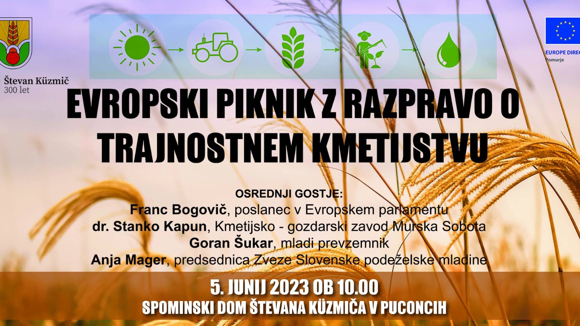 Glavno dejanje bo moderirana razprava na temo Trajnostnega kmetijstva med Francem Bogovičem, poslancem v Evropskem parlamentu, dr. Stankom Kapunom, direktorjem Kmetijsko-gozdarskega zavoda Murska Sobota, Anjo Mager, predsednico Zveze Slovenske podeželske mladine, in Goranom Šukarjem, mladim prevzemnikom iz Bodonec.