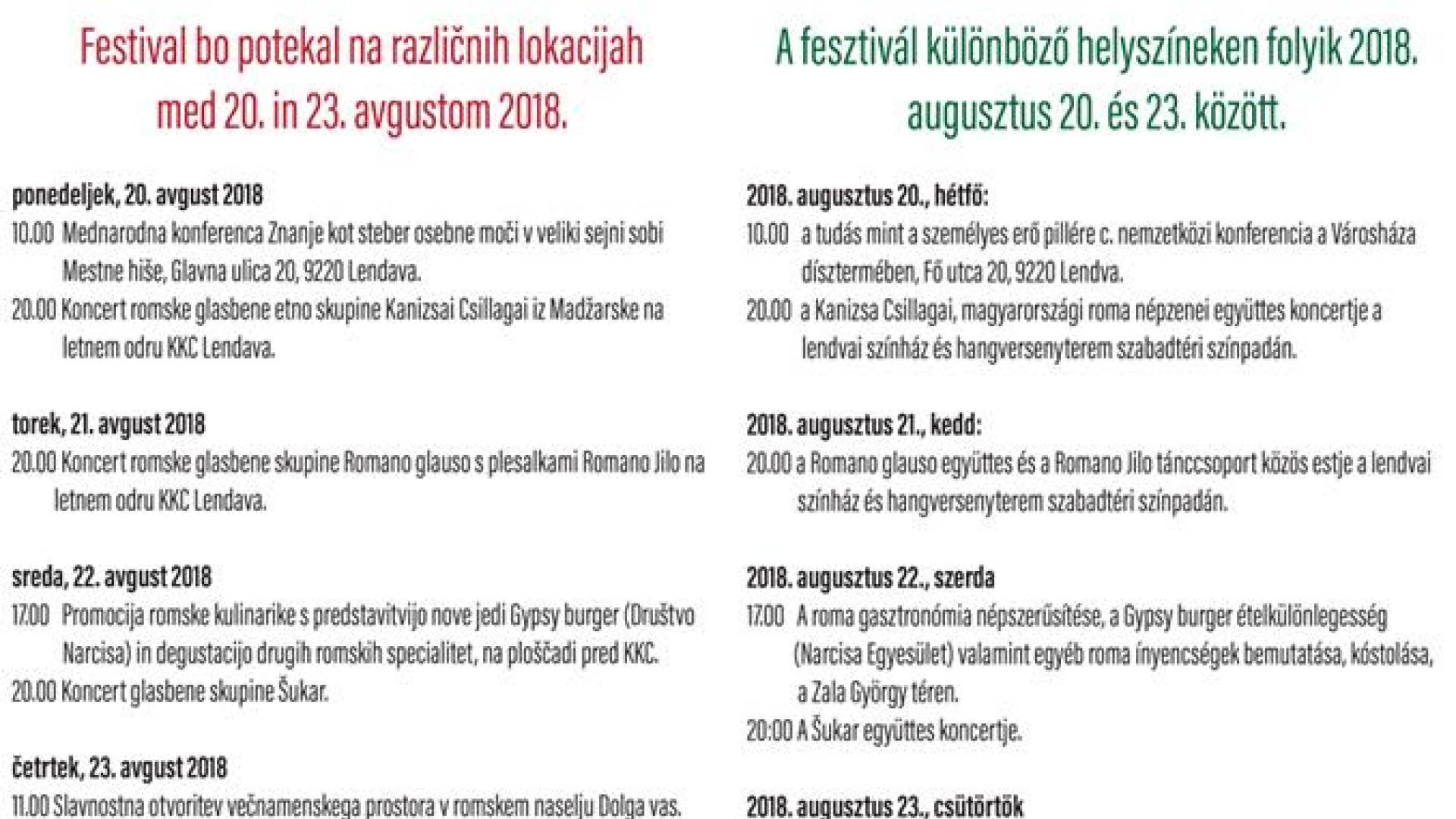 Vabimo vas na Festival romske glasbe, plesa in kulinarike, ki ga prireja Romsko kulturno društvo Romnji v sodelovanju z Ljudsko univerzo Lendava, Občino Lendava, Zvezo za razvoj romske manjšine Preporod, Klubom študentov Lendava in Romskim akademskim klubom.