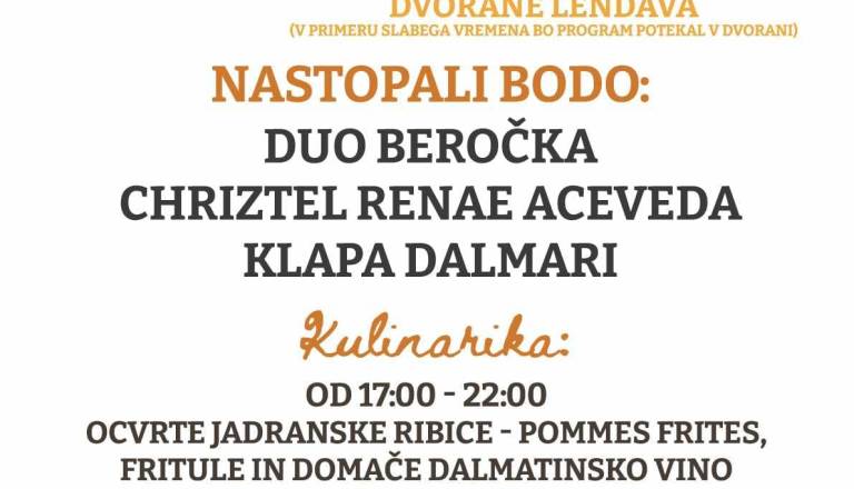 18.00 | Letni oder Gledališke in koncertne dvorane Lendava etnološka prireditev, glasba, kulinarika Festival Vinarium 2023 Hrvaški etno večer Pevski nastop ...