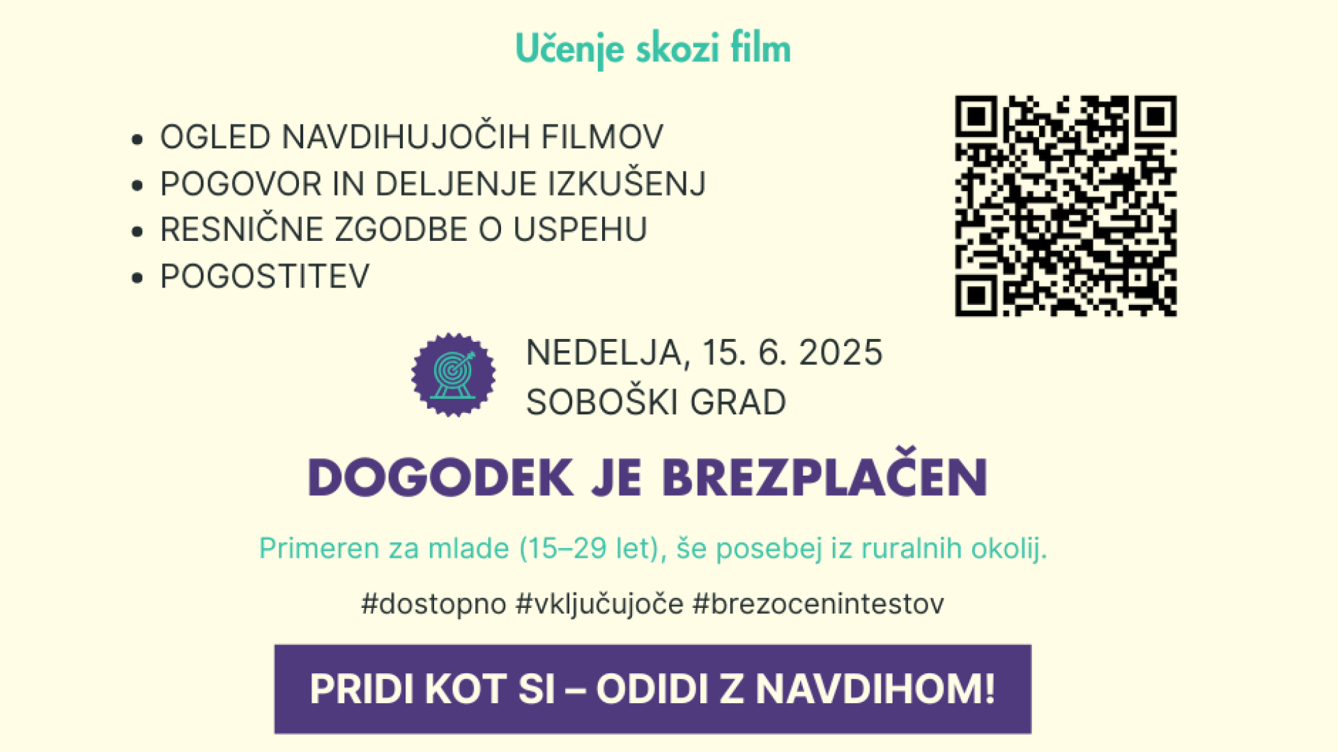 Dogodek z naslovom »Učenje skozi film« združuje ogled treh izbranih filmov s poglobljeno razpravo z mladimi in strokovnjaki. Namen dogodka je spodbuditi razmislek, dialog in boljše razumevanje izzivov, s katerimi se mladi soočajo danes, sploh na področju izobraževanja.