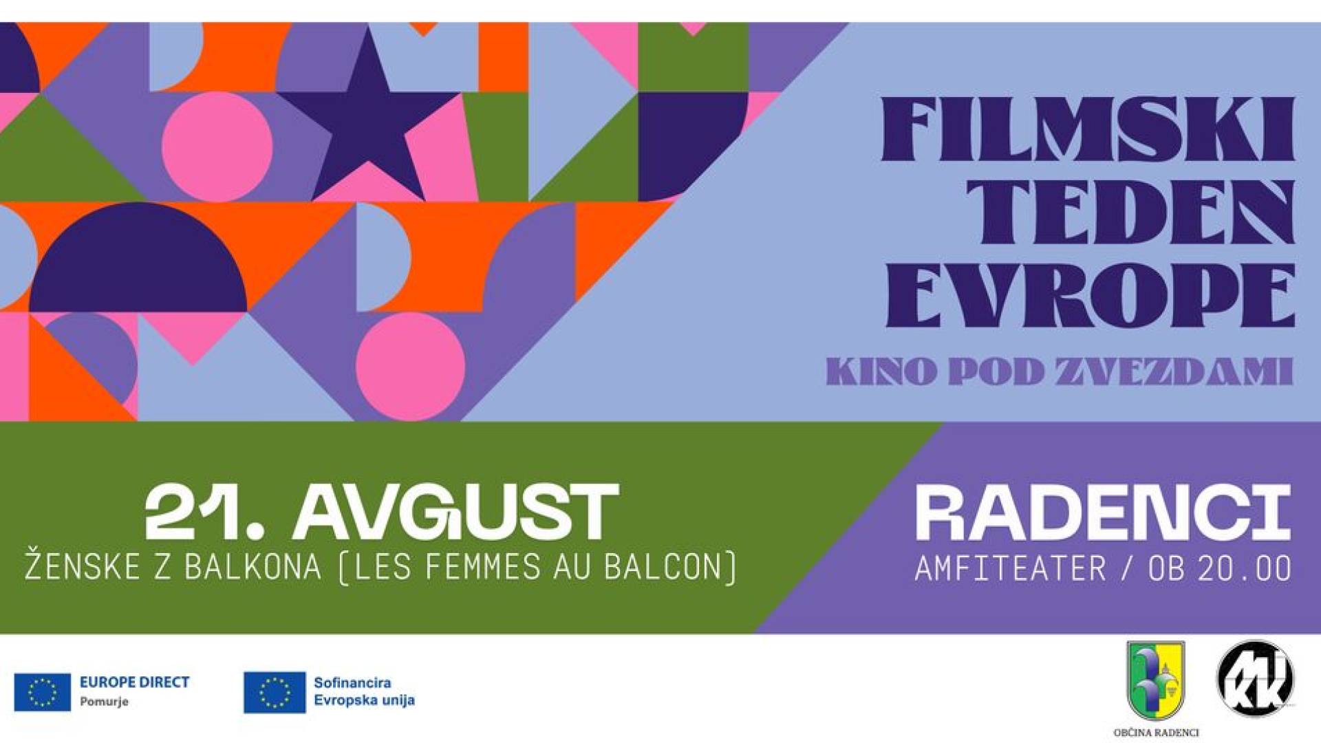 Amfiteater RadenciInformacijska točka Europe Direct Pomurje in Občina Radenci vabita na projekcijo filma Ženske z balkona v okviru Filmskih tednov Evrope 2025. Dogodek bo potekal v Amfiteatru v Parku Radenci v četrtek, 21. avgusta 2025, s pričetkom ob 20. uri.