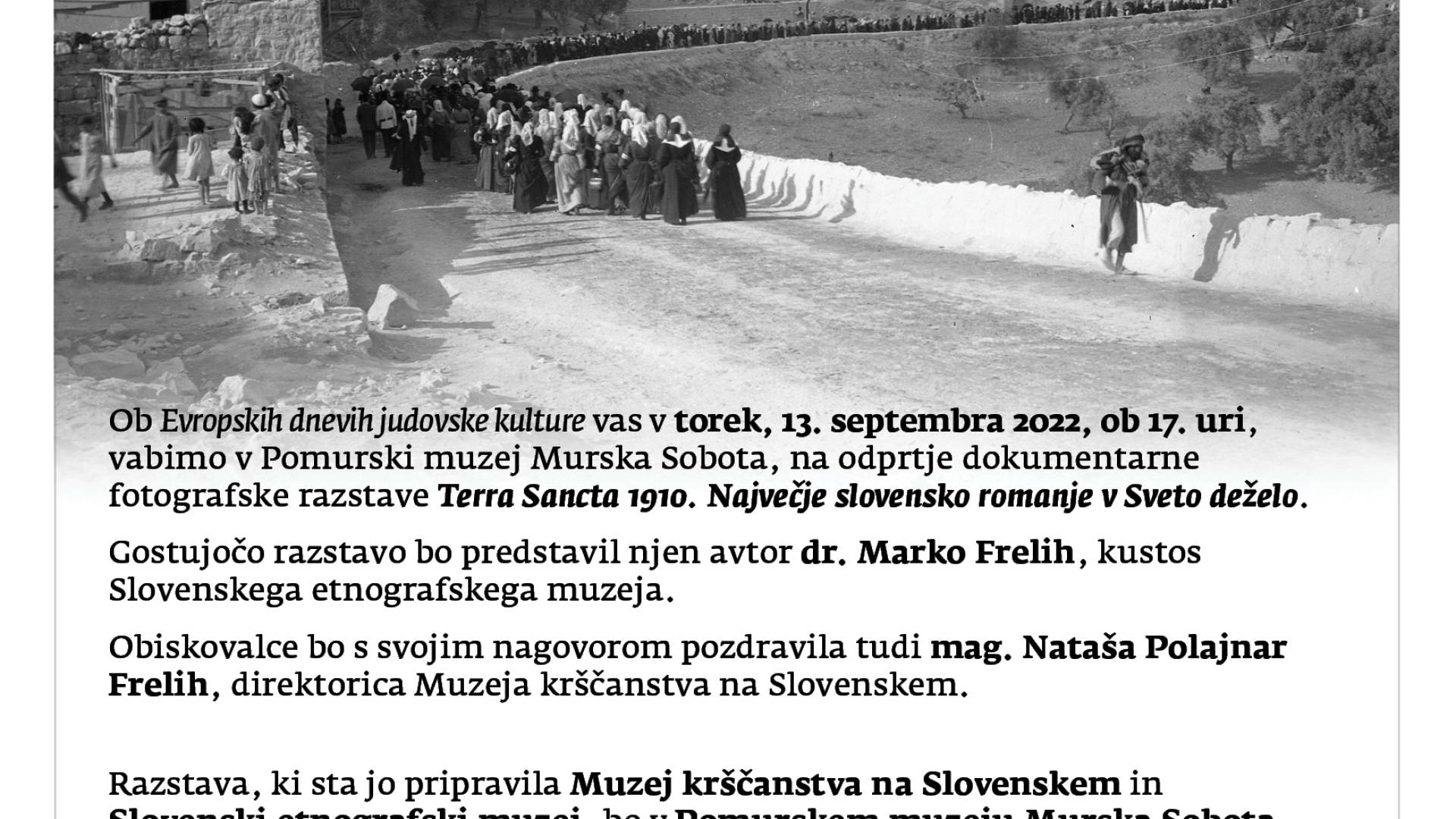 Pomurski muzej Murska SobotaVabimo vas na odprtje dokumentarne fotografske razstave Terra Sancta 1910. Največje slovensko romanje v Sveto deželo v torek, 13. septembra 2022, ob 17. uri.