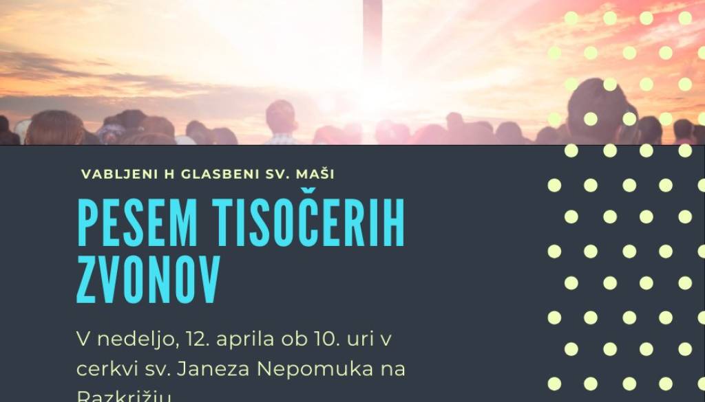 Župnijska cerkev sv. Janeza Nepomuka na Razkrižju12. aprila 2026 ob 10. uri bodo pevci glasbene maše Pesem tisočerih zvonov, obiskali našo župnijsko cerkev na Razkrižju. Pevci prihajajo iz različnih koncev naše Slovenije in svojo bogato pevsko zapuščino delijo med Slovenci doma in v tujini, že 40 let. Na Razkrižju se jim bomo pridružili tudi domači pevci MPZ župnije Razkrižje.