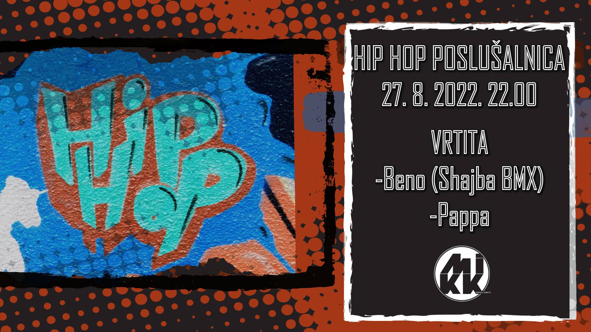 V tokratni poslušalnici bomo prisluhnili Hip-Hop glasbi, ki jo bosta selektirala Pappa in Beno (Shajba BMX). Pridite se podružit na Grajsko dvorišče.