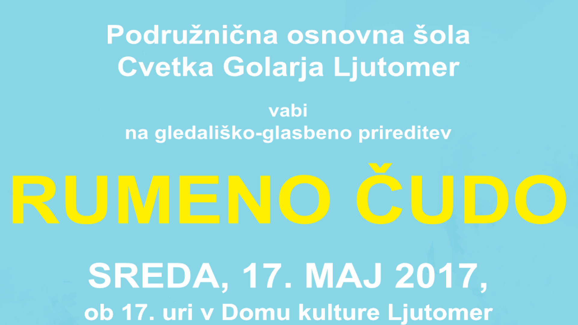 Dom kulture LjutomerPodružnična OŠ Cvetka Golarja Ljutomer in Lions klub Ljutomer vabita na gledališko- glasbeno prireditev z naslovom Rumeno čudo, ki bo v sredo, 17.5.2017, ob 17. uri v Domu kulture Ljutomer.