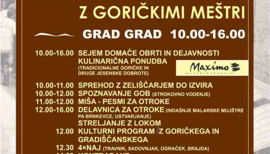 Poleg sejemskega vrveža ter tradicionalnih goričkih in drugih jesenskih dobrot, se bodo obiskovalci prireditve lahko sprehodili z zeliščarjem, spoznavali gobe, prisluhnili kulturnemu programu Goričkega in Gradiščanskega, razglasitvam Naj travnik, Naj visokodebelni sadovnjak, Naj ograček in Naj brajda Goričkega v letu 2017 ter se prepustili glasbi skupine Kontrabant. Mlajši obiskovalci bodo lahko prisluhnili pesmim za otroke, ustvarjali v delavnicah (Indašnje malarske mujštre pa brnkevce) in se preizkusili v streljanju z lokom.