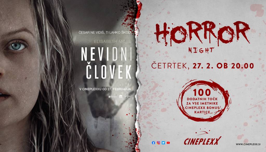 V kinu Cineplexx (Maximus) v Murski SobotiKonec februarja najpogumnejše čaka srhljivka, z novim zloglasnim likom - ki pa je neviden. Cecilia Kass (Elisabeth Moss) je ujeta v nasilnem razmerju s premožnim in genialnim znanstvenikom. Ko le ta naredi samomor in ji zapusti velikodušen del njegovega velikega bogastva, Cecilia prične sumiti, da je njegova smrt zaigrana. Po nizu grozovitih naključij, ki njo in njene bližnje spravljajo v smrtno nevarnost, Cecilia na vsak način skuša dokazati, da ji sledi nekdo, ki je neviden.