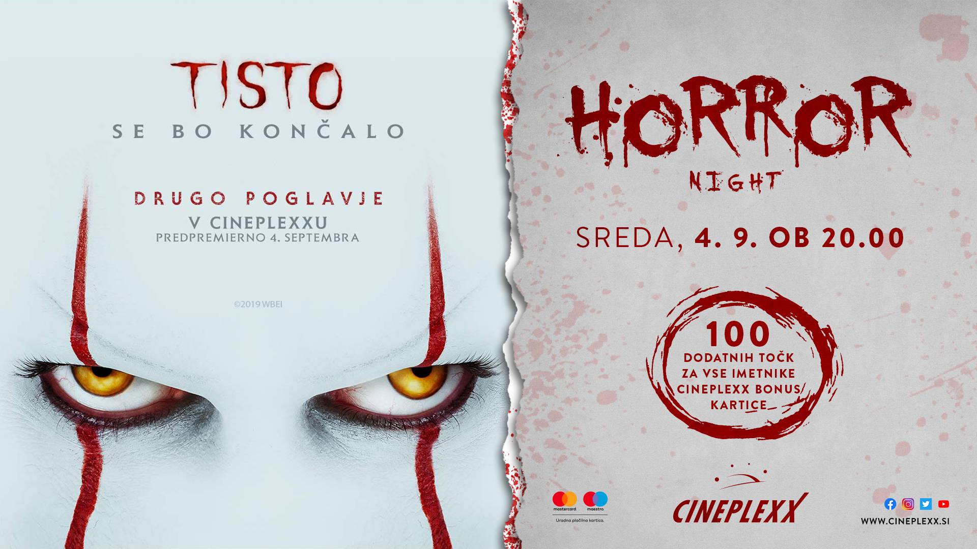 V kinu Cineplexx (Maximus) v Murski SobotiNajbolj poznan in strašljiv klovn Pennywise se vrača v najbolj pričakovani grozljivki leta - Tisto: Drugo poglavje. Upaš na Horror night, ki bo v sredo 4. septembra ob 20.00 v Cineplexxu Murska Sobota?