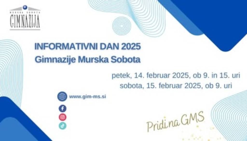 Gimnazija Murska SobotaGimnazija Murska Sobota bo informativne dneve organizirala v petek, 14. februarja 2025, ob 9. in 15. uri, ter v soboto, 15. februarja 2025, ob 9. uri.