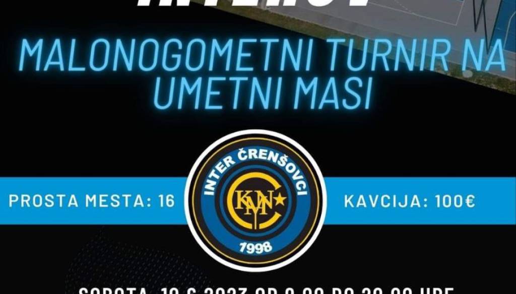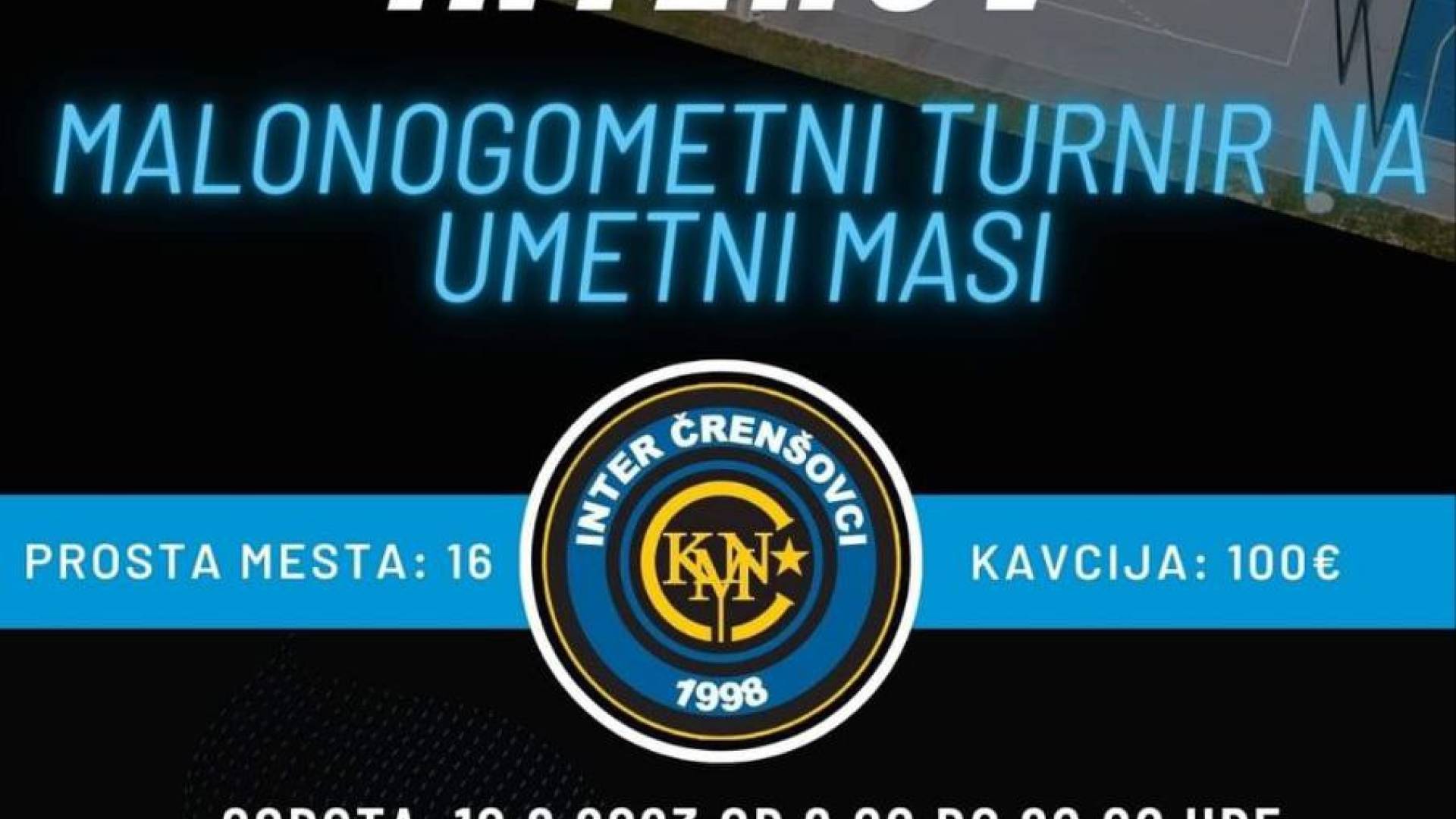 Interov malonogometni turnir na umetni masi Jana Bohar | 1. junij 2023 09:03 v Termin Sobota, 10. junij 2023 9:00 - Sobota, 10. junij 2023 20:00 Lokacija Nogometno igrišče Črenšovci Vabljeni!