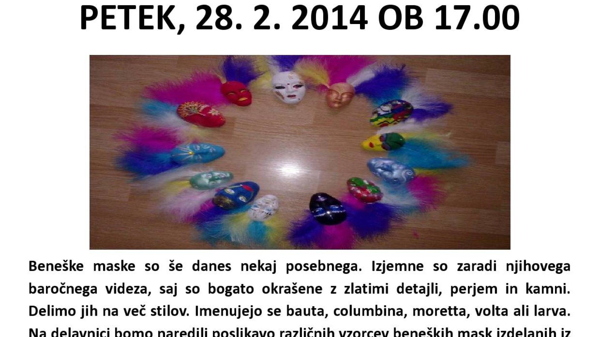 Sofija LendavaBeneške maske so še danes nekaj posebnega. Izjemne so zaradi njihovega baročnega videza, saj so bogato okrašene z zlatimi detajli, perjem in kamni. Delimo jih na več stilov. Imenujejo se bauta, columbina, moretta, volta ali larva. Na delavnici bomo naredili poslikavo različnih vzorcev beneških mask izdelanih iz gipsa, ki jih bomo okrasili z različnimi detajli, perjem in kamni. Vsak udeleženec prejme svojo izdelano beneško masko. Vabljeni, da se nam pridružite pri izdelavi beneških mask, kjer domišljija nima meja! Prispevek za delavnico je 3 €. Število udeležencev je omejeno, potrebne so prijave.