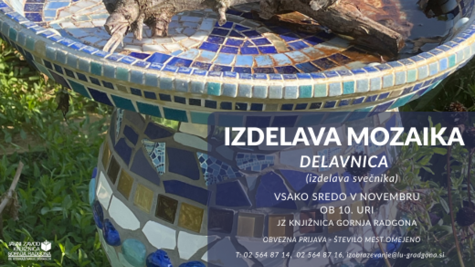 JZ Knjižnica Gornja RadgonaVljudno vabljeni na delavnico Izdelava mozaika, ki jo bo vodila likovna umetnostna terapevtka, umetnica in mozaicistka Dajana von Fintel
