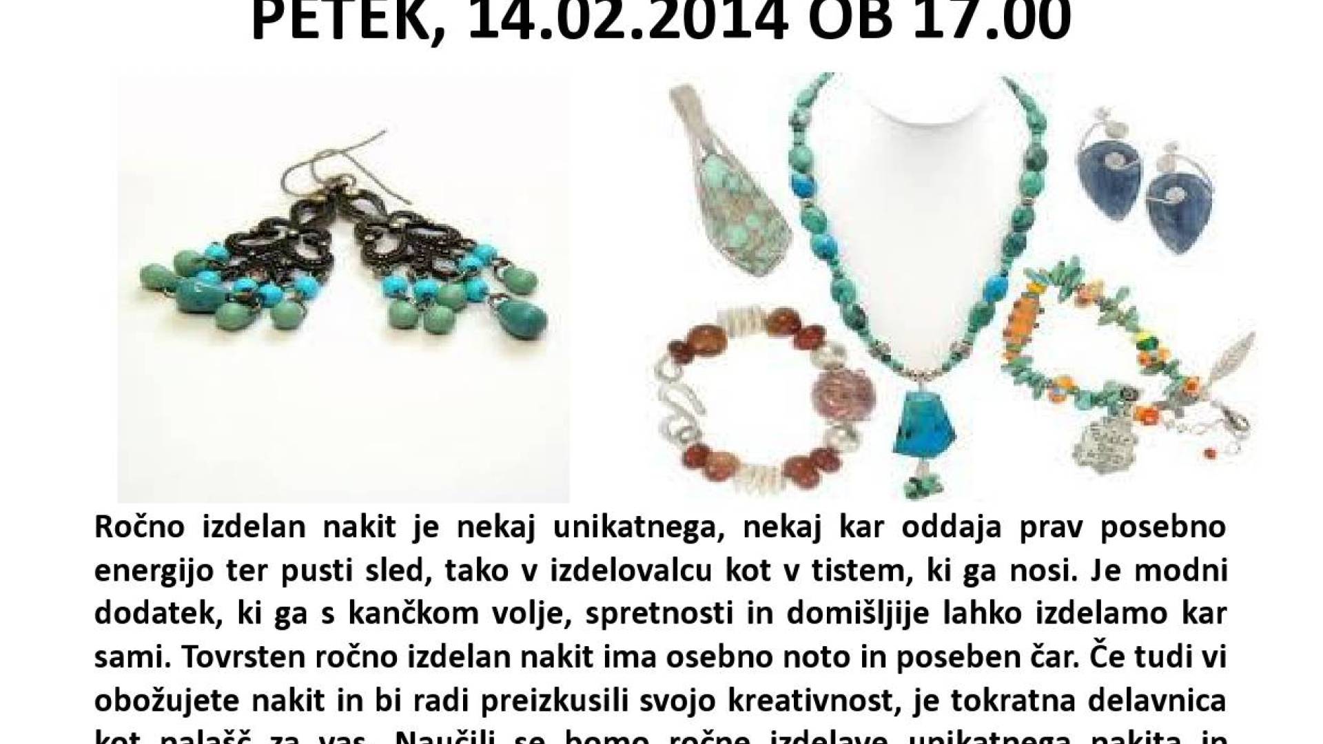 Sofija LendavaRočno izdelan nakit je nekaj unikatnega, nekaj kar oddaja prav posebno energijo ter pusti sled, tako v izdelovalcu kot v tistem, ki ga nosi. Je modni dodatek, ki ga s kančkom volje, spretnosti in domišljije lahko izdelamo kar sami. Tovrsten ročno izdelan nakit ima osebno noto in poseben čar. Če tudi vi obožujete nakit in bi radi preizkusili svojo kreativnost, je tokratna delavnica kot nalašč za vas. Naučili se bomo ročne izdelave unikatnega nakita in izdelali vsak svoje uhane iz perlic in žice, ki jih boste ob koncu tudi prejeli. Cena delavnice je 3 € za materialne stroške.