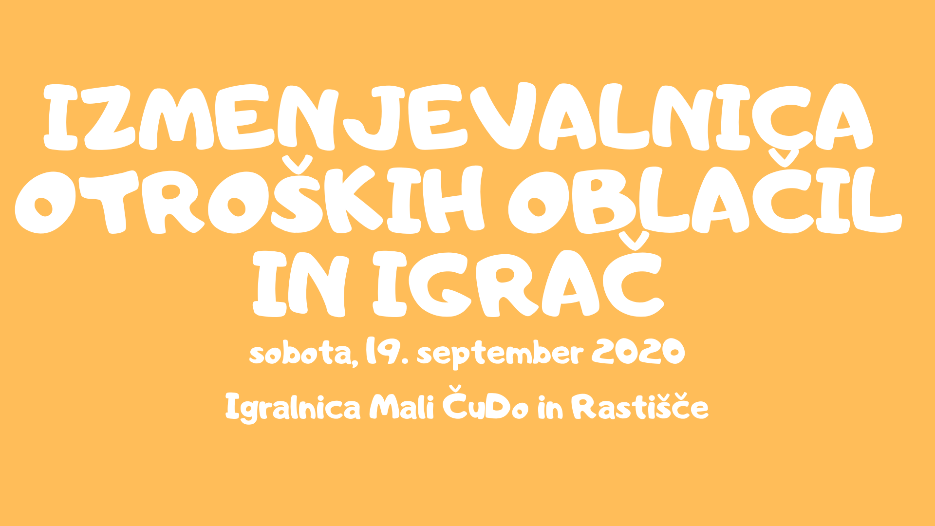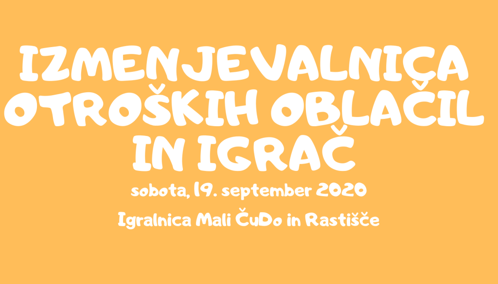 Izmenjevalnica otroških oblačil, igrač in vsega ostalega bo potekala v soboto, 19. septembra 2020, med 9.00 in 13.00, v prostorih Igralnice Mali ČuDo, ki se nahaja v ulici Štefana Kovača 6, poleg Cafe Park-a.