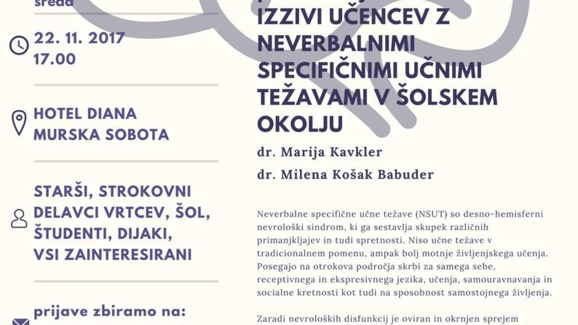 Hotel Diana Murska SobotaO predavateljicah: Dr. Marija Kavkler in dr. Milena Košak Babuder sta predavateljici na Oddelku Specialno-rehabilitacijske pedagogike Pedagoške fakultete Univerze v Ljubljani. Obe sta dejavni v Društvu Bravo.