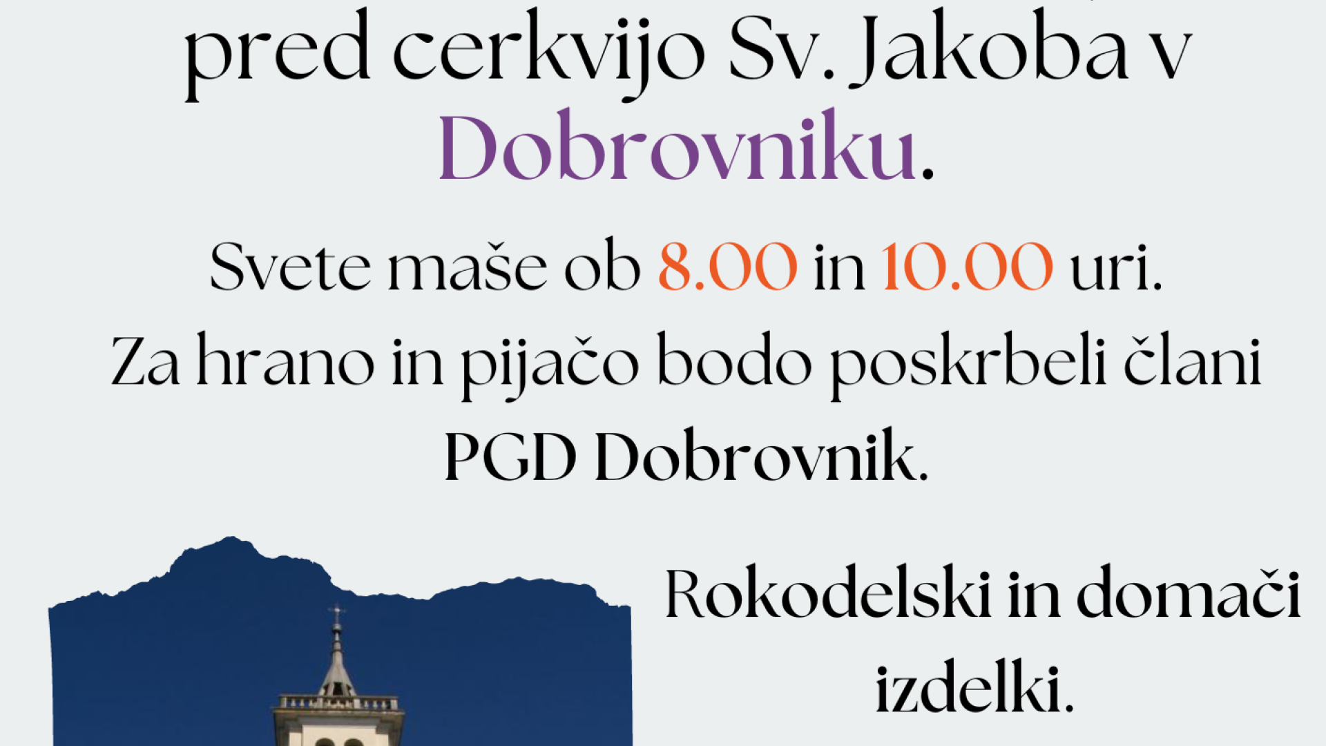 DOBROVNIKVabljeni na tradicionalni Jakobov sejem, ki bo pred cerkvijo Sv.Jakoba v Dobrovniku!