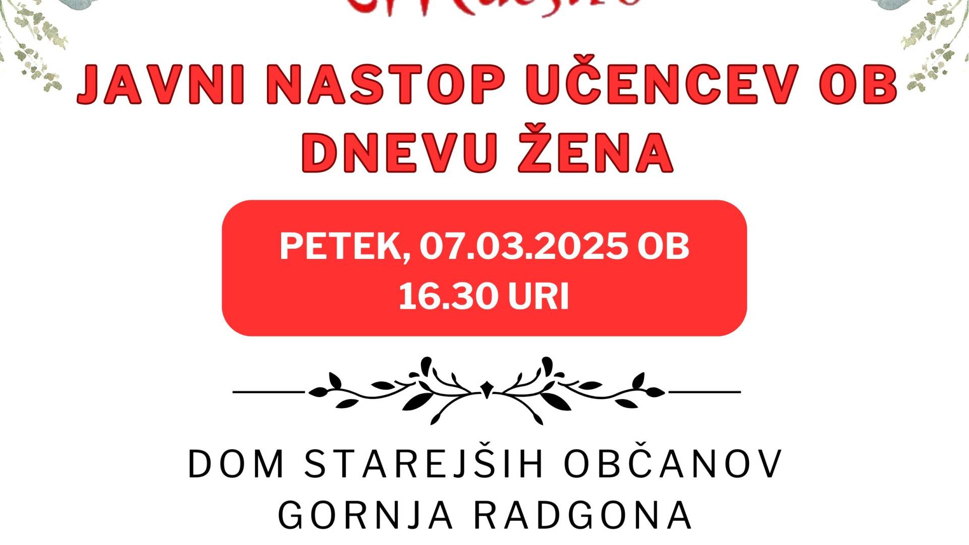 Javni nastop učencev za Dan žena gregor1 | 4. marec 2025 12:00 v Glasba Termin Petek, 7. marec 2025 16:30 Lokacija Dom starejših občanov Gornja Radgona Javni nastop učencev za Dan žena