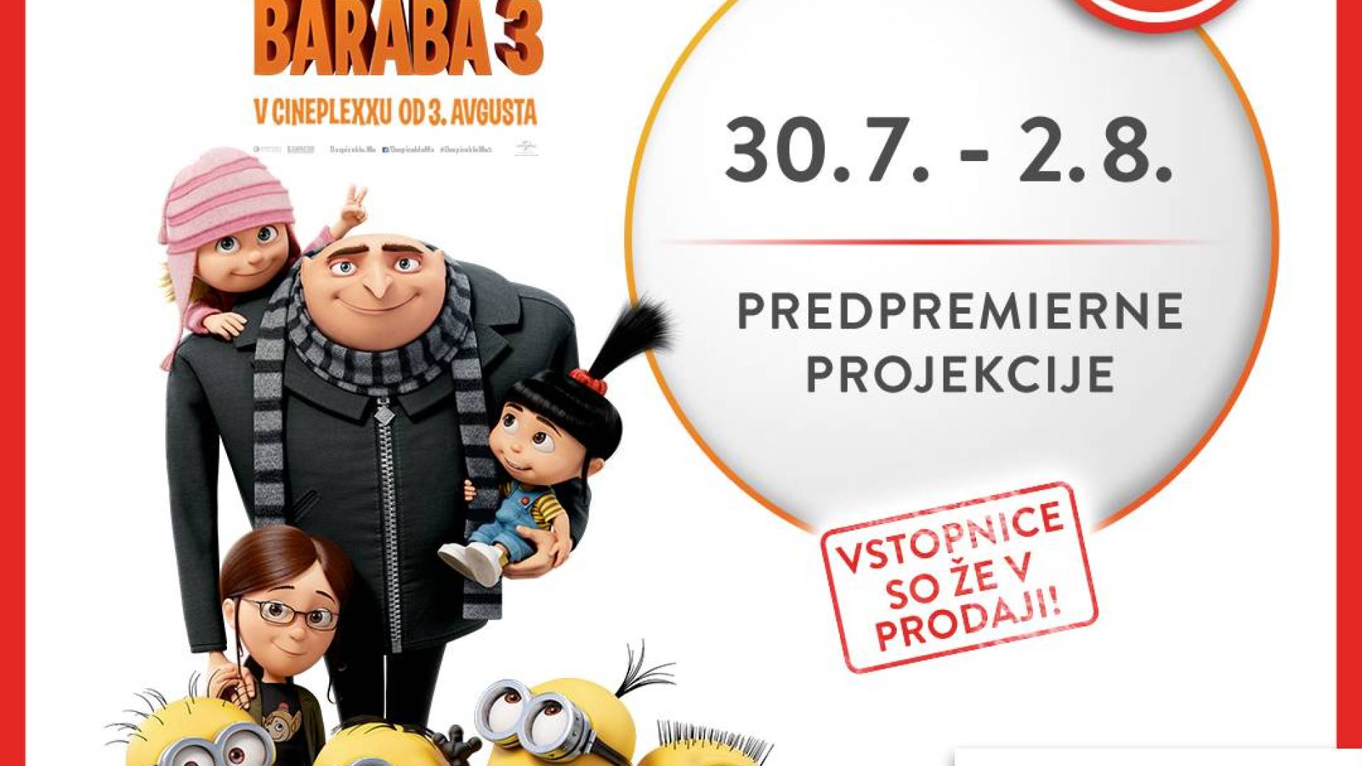 V kinu Cineplexx (Maximus) v Murski SobotiV času predpremiernih projekcij animirane pustolovščine Jaz, baraba 3 med 30.7. in 2.8. v Cineplexxu Murska Sobota čakajo otroke pobarvanke in baloni v otroškem kotičku. Rezervacija ter nakup vstopnice na: https://goo.gl/wSC6wt