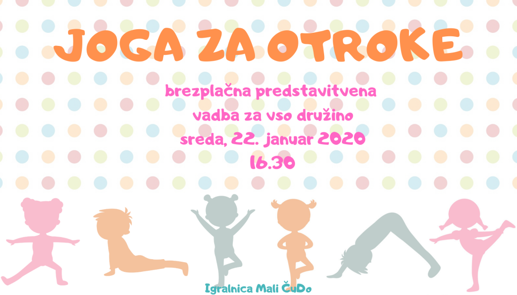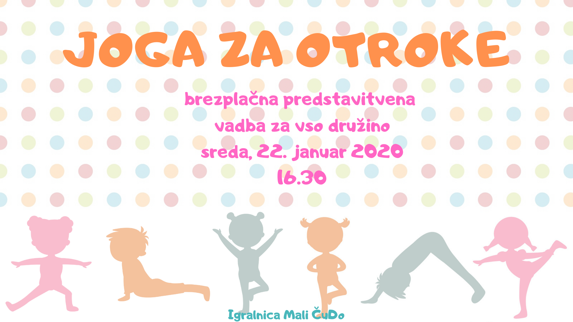 Igralnica Mali ČuDoV sredo, 22. januarja 2020 vabljeni na brezplačno vadbo. Spoznali bomo jutranjo jogo, da bodo jutra polna energije in notranjega miru, različne asane (položaje) ter tehnike dihanja. Vabljeni otroci med 4. in 11. letom starosti ter starši in stari starši. Predstavitvena delavnica je brezplačna, traja 45 minut in primerna za družine.