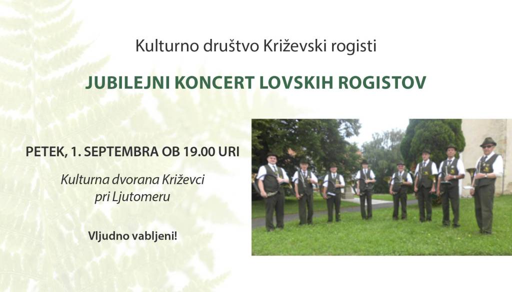 Kulturna dvorana Križevci pri LjutomeruKulturno društvo Križevski rogisti v petek, 1. septembra, ob 19. uri v Kulturni dvorani Križevci pri Ljutomeru pripravlja Jubilejni koncert lovskih rogistov.