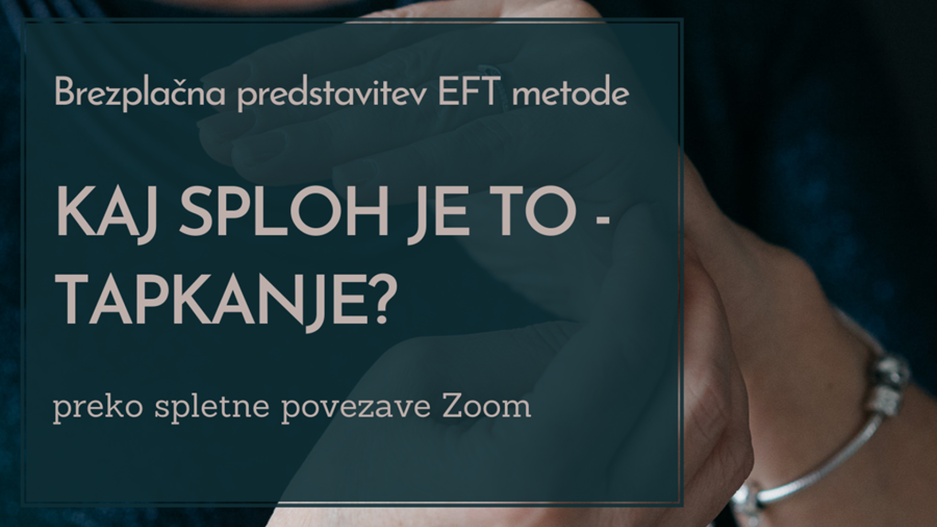 Preko spletne povezave ZoomNa predstavitvi boste izvedeli, kaj je EFT metoda in kako nam lahko tapkanje pomaga na različnih področjih našega življenja - kaj vse lahko olajšamo ali odpravimo, spremenimo na bolje ter koliko vsega pridobimo, medtem, ko tapkamo s prsti po določenih točkah na obrazu in telesu.