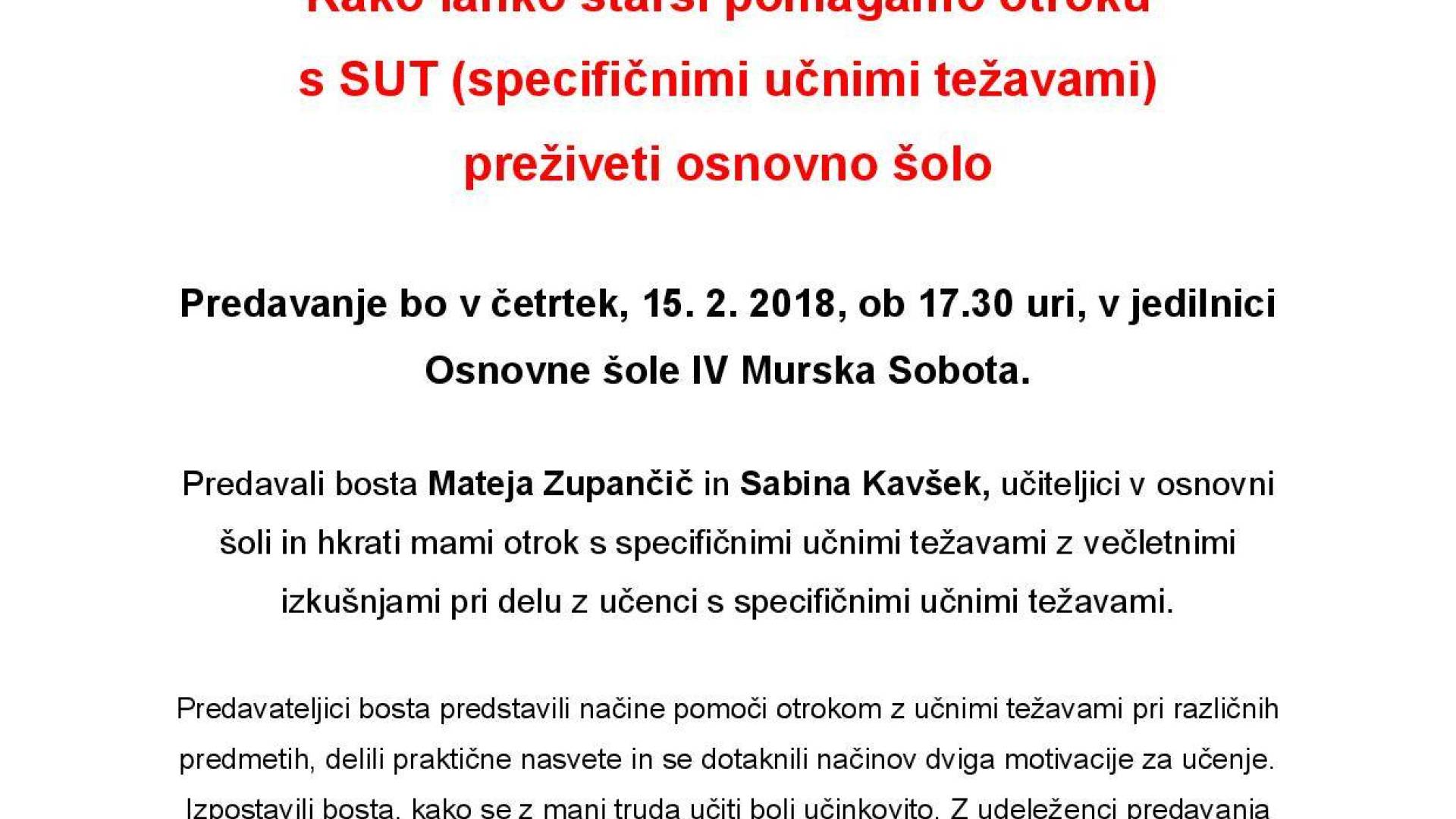 Osnovna šola IV Murska SobotaDruštvo Bravo, enota Pomurje, vabi na predavanje Kako lahko starši pomagamo otroku s SUT preživeti osnovno šolo. Predavali bosta ga. Mateja Zupančič in ga. Sabina Kavšek, učiteljici v osnovni šoli in hkrati mami otrok s specifičnimi učnimi težavami z večletnimi izkušnjami pri delu z učenci s specifičnimi učnimi težavami.
