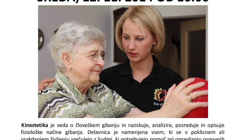 V teoretičnem delu bomo predstavili osnovne pojme kinestetike in pomembnost le-te. V praktičnem delu bomo prikazali tehnike in pripomočke za varno delo. Delavnico bo vodila ga. Cvetka Mauko, socialna oskrbovalka Zavoda Domania.