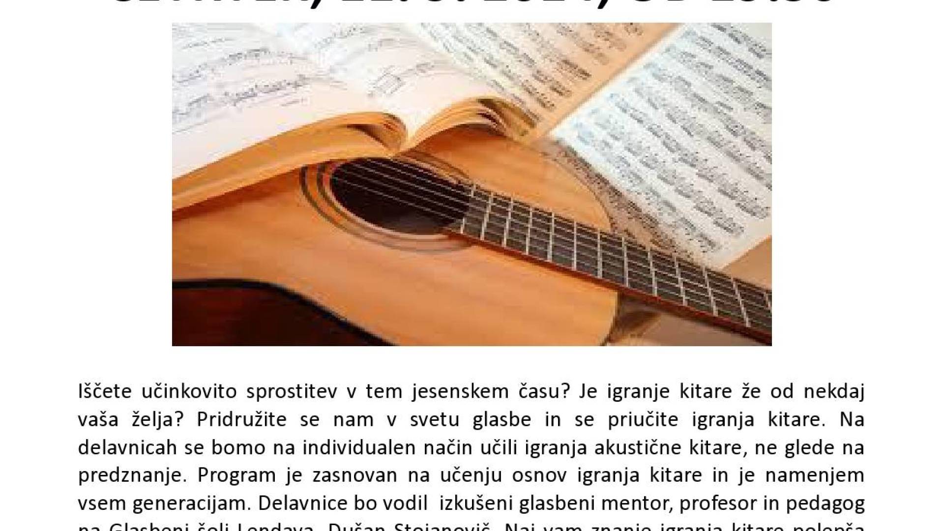 Sofija medgeneracijska hiša Lendava Glavna ulica 48 9220 LendavaIščete učinkovito sprostitev v tem jesenskem času? Je igranje kitare že od nekdaj vaša želja? Pridružite se nam v svetu glasbe in se priučite igranja kitare. Na delavnicah se bomo na individualen način učili igranja akustične kitare, ne glede na predznanje. Program je zasnovan na učenju osnov igranja kitare in je namenjem vsem generacijam. Delavnice bo vodil izkušeni glasbeni mentor, profesor in pedagog na Glasbeni šoli Lendava, Dušan Stojanovič. Naj vam znanje igranja kitare polepša vaš vsakdan, omogoči nova prijateljstva in prijetna doživetja.