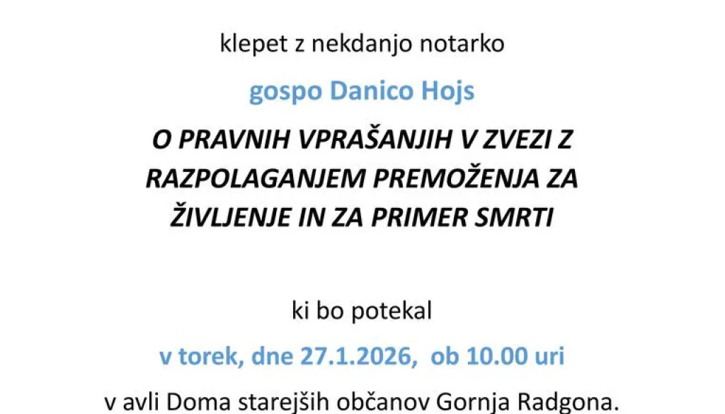 Pogovor bo namenjen pravnim vprašanjem v zvezi z razpolaganjem premoženja za časa življenja in za primer smrti.