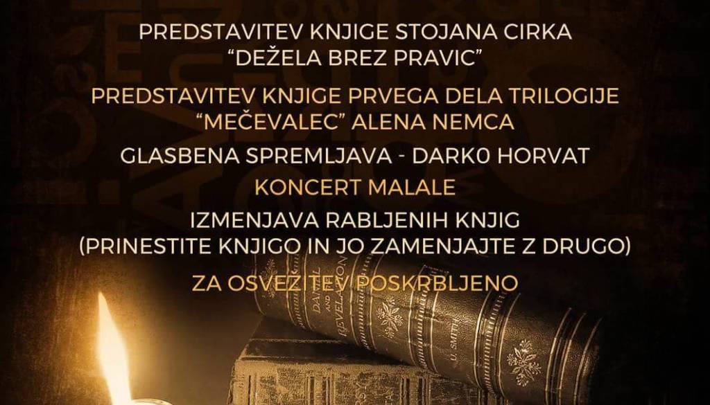 Na Knjižnem sejmu bomo predstavili knjigo Stojana Cirka »Dežela brez pravic« ter prvo knjigo trilogije »Mečevalec« mladega avtorja Alena Nemca. Za prijetno vzdušje na sprejemu bo poskrbel Darko Horvat z izborom prijetne glasbe na akustični kitari, kot poslastica večera pa bo krajši koncert Malale.