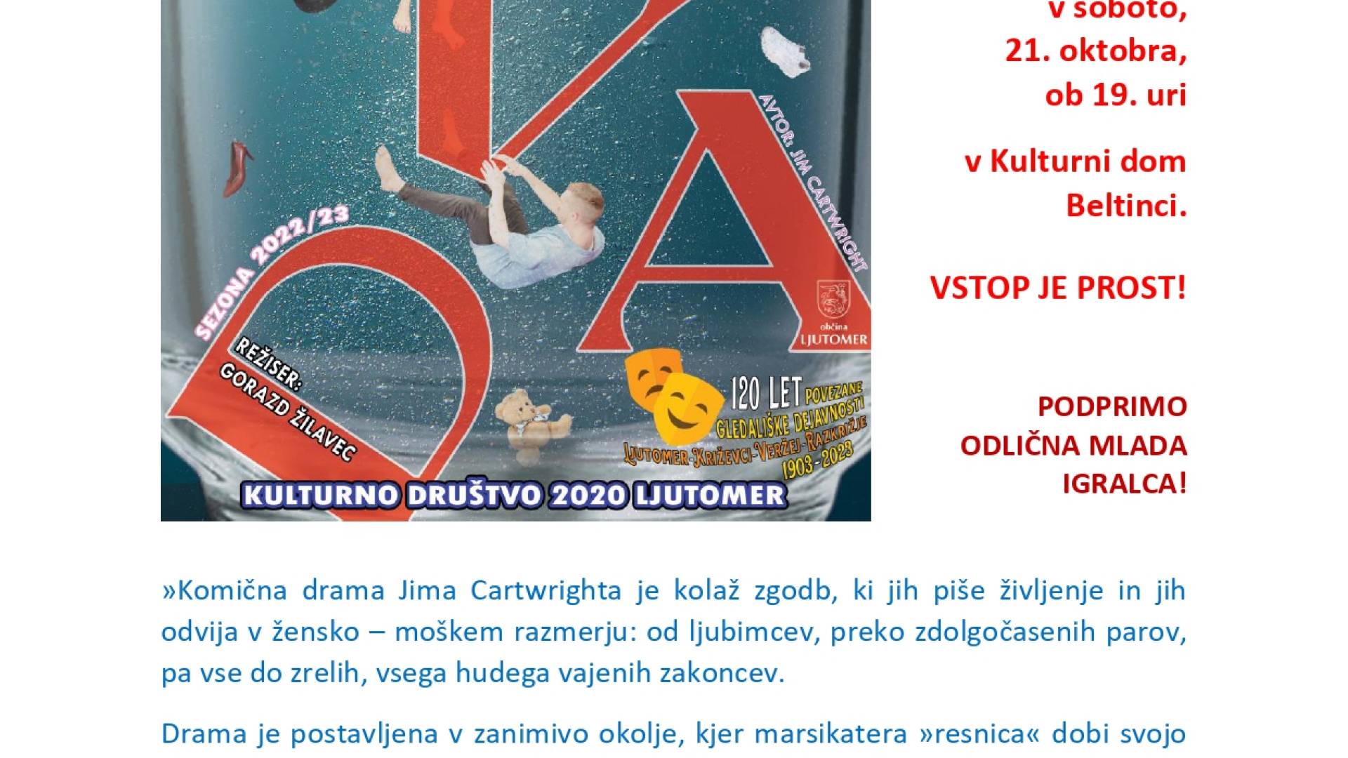Komična drama DVA Jana Bohar | 12. oktober 2023 09:36 v Termin Sobota, 21. oktober 2023 19:00 Lokacija Kulturni dom Beltinci Vabljeni!