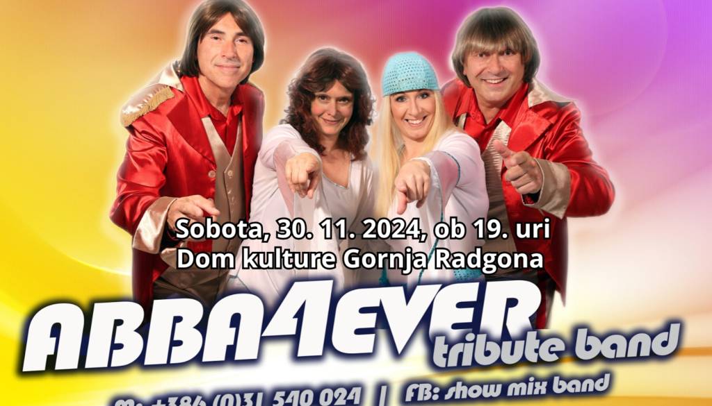 Dom kulture Gornja RadgonaV radgonski hram kulture prihaja veličasten zvok sedemdesetih s skupino ABBA4ever tribute bandom. Ne zamudite odličnega koncerta, ki bo v soboto, 30. novembra 2024, ob 19. uri.
