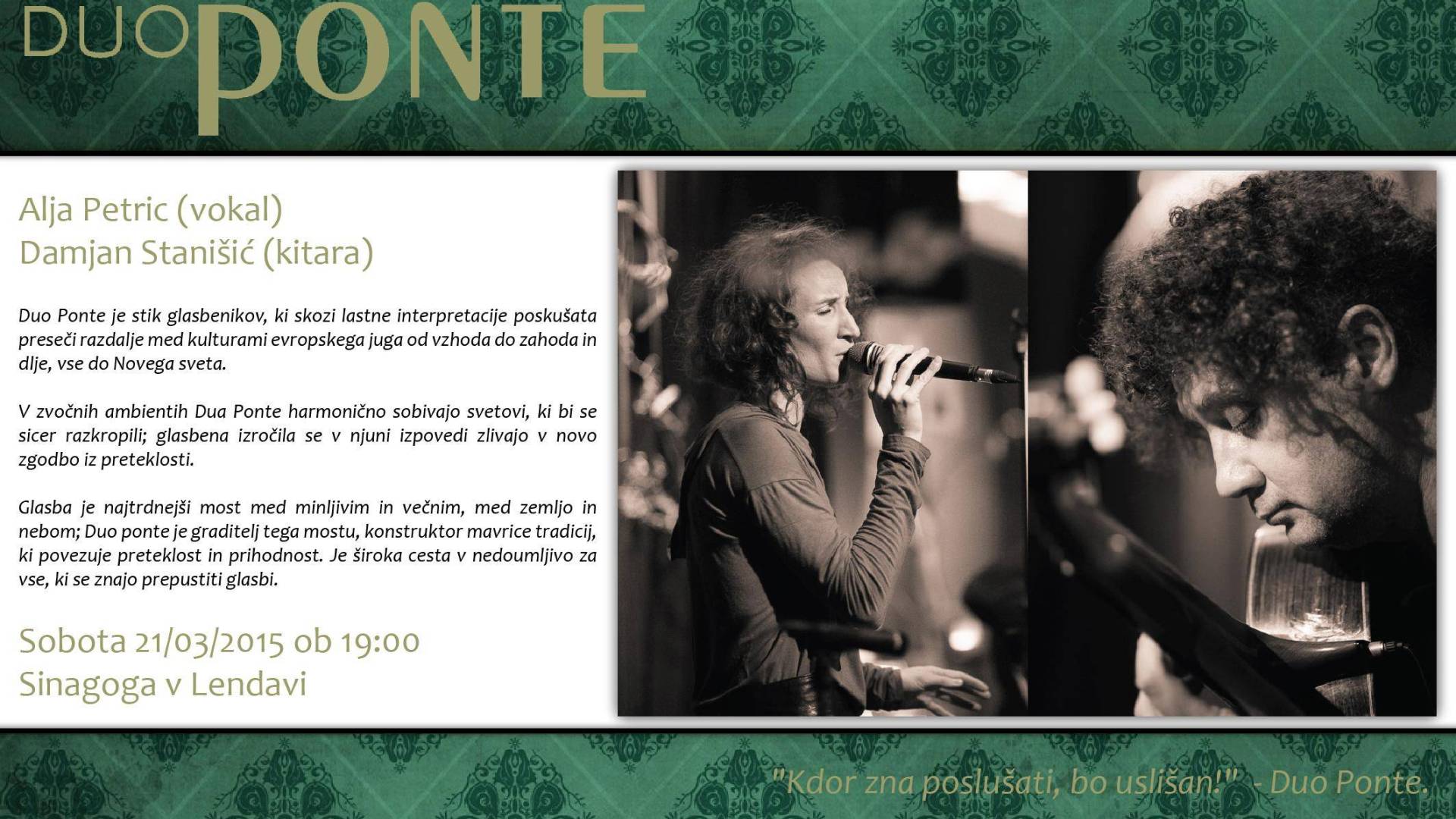 Duo Ponte je stik glasbenikov, ki skozi lastne interpretacije poskušata preseči razdalje med kulturami evropskega juga od vzhoda do zahoda in dlje, vse do Novega sveta.