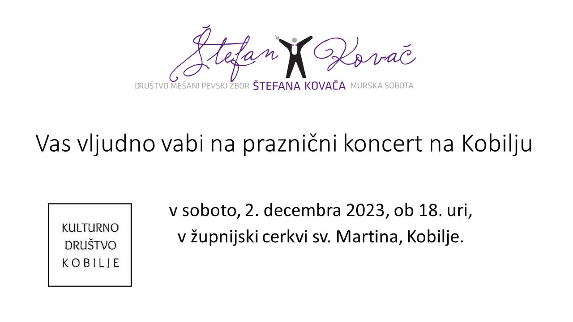 Vljudno vabljeni na praznični koncert MePZ Štefana Kovača iz Murske Sobote, ki bo ob 17.00 in ne ob 18.00, kot je bilo prvotno objavljeno. Vstop je prost.