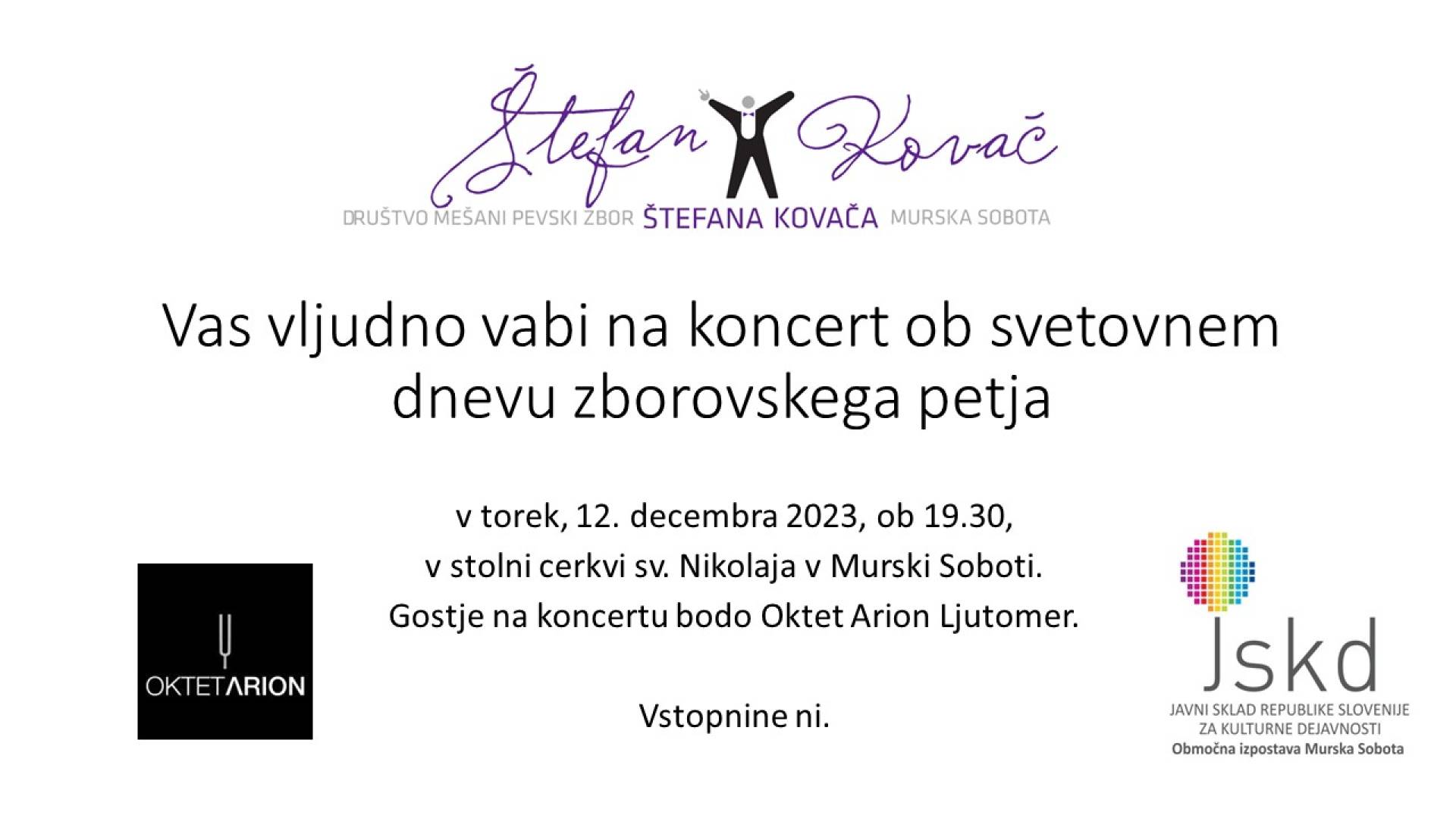 Stolna cerkev sv. Nikolaja Murska SobotaVljudno vabljeni na koncert MePZ Štefana Kovača ob svetovnem dnevu zborovskega petja. Gostje bodo Oktet Arion iz Ljutomera. Vstop je prost.