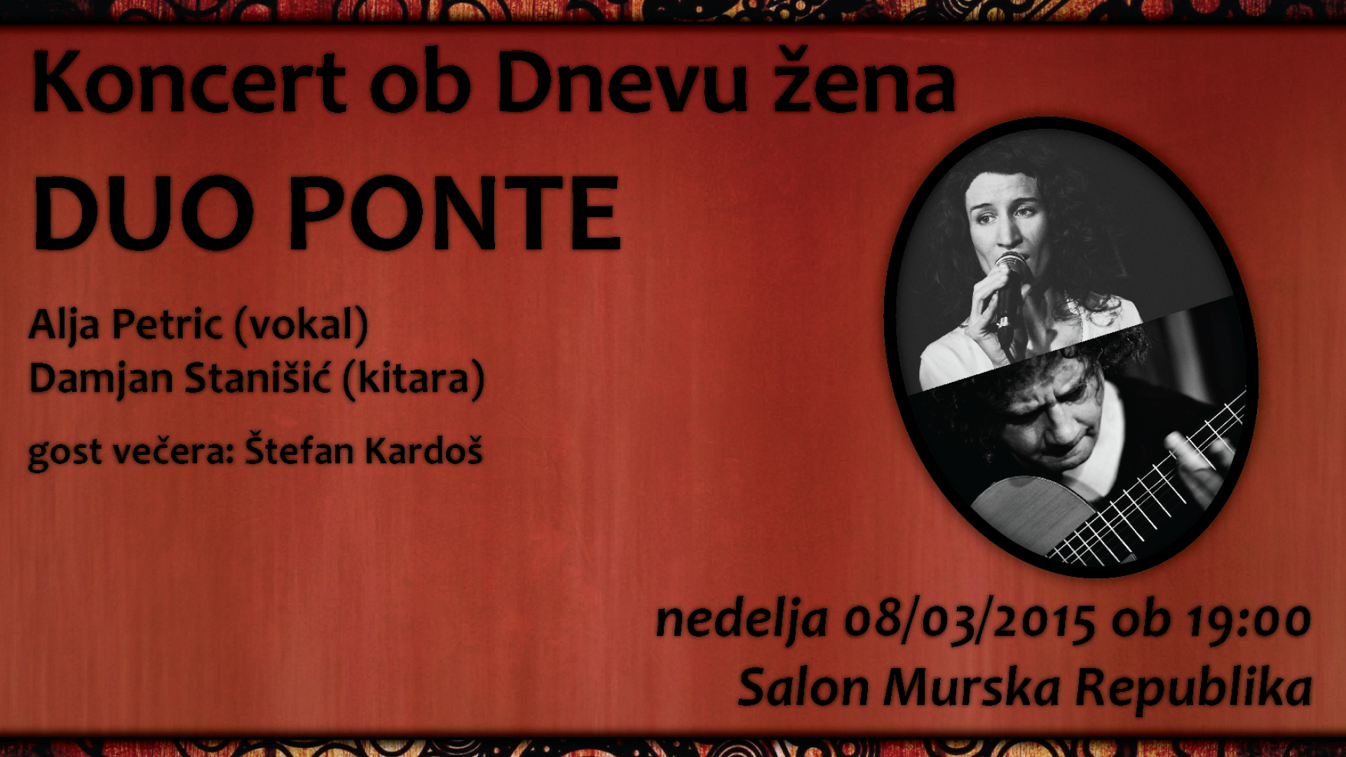 Prežitive ta čudoviti praznik posvečen ženskam v prijetnem ambientu Salona Murska Republika v centru Murske Sobote. Večer bo poln ognjevitih kitarskih dotikov objetih v skrivnostno milino svilenega vokala, ki skupaj združujeta zemeljsko z nebeškim.