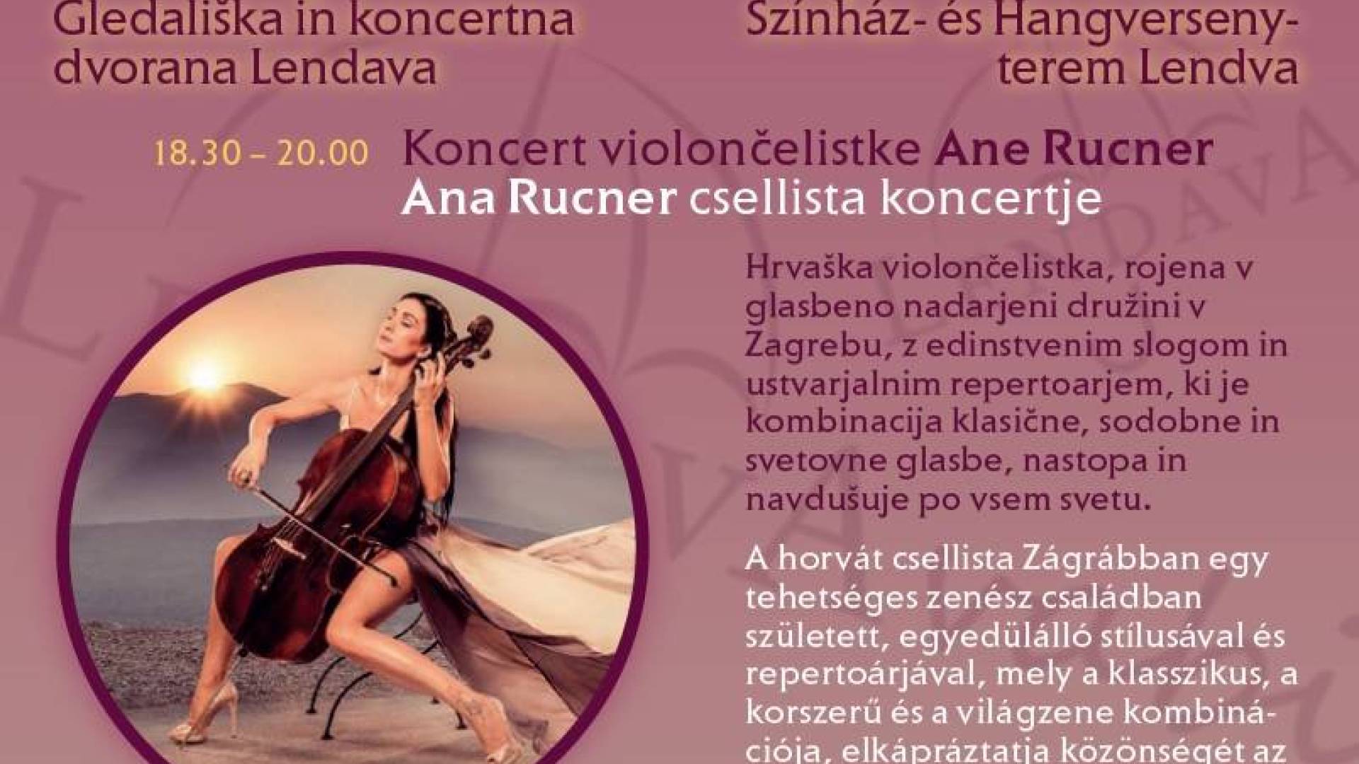 Gledališka in koncertna dvorana LendavaVabimo vas na koncert hrvaške violončelistke, Ane Rucner, ki bo v petek, 29. avgusta 2014 ob 18.30 uri v Gledališki in koncertni dvorani.