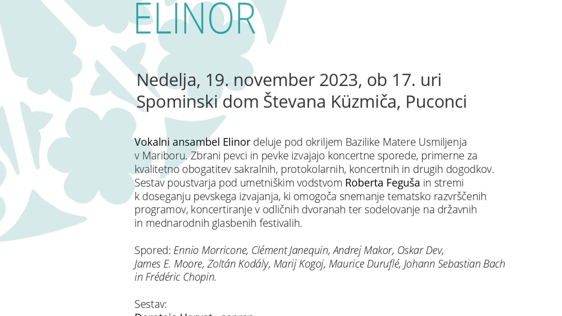Spominski dom Števana Küzmiča v PuconcihV nedeljo, 19. novembra, se bo v Spominskem domu Števana Küzmiča odvil koncert Vokalnega ansambla Elinor, ki sodi med prepoznavne slovenske vokalno glasbene sestave.
