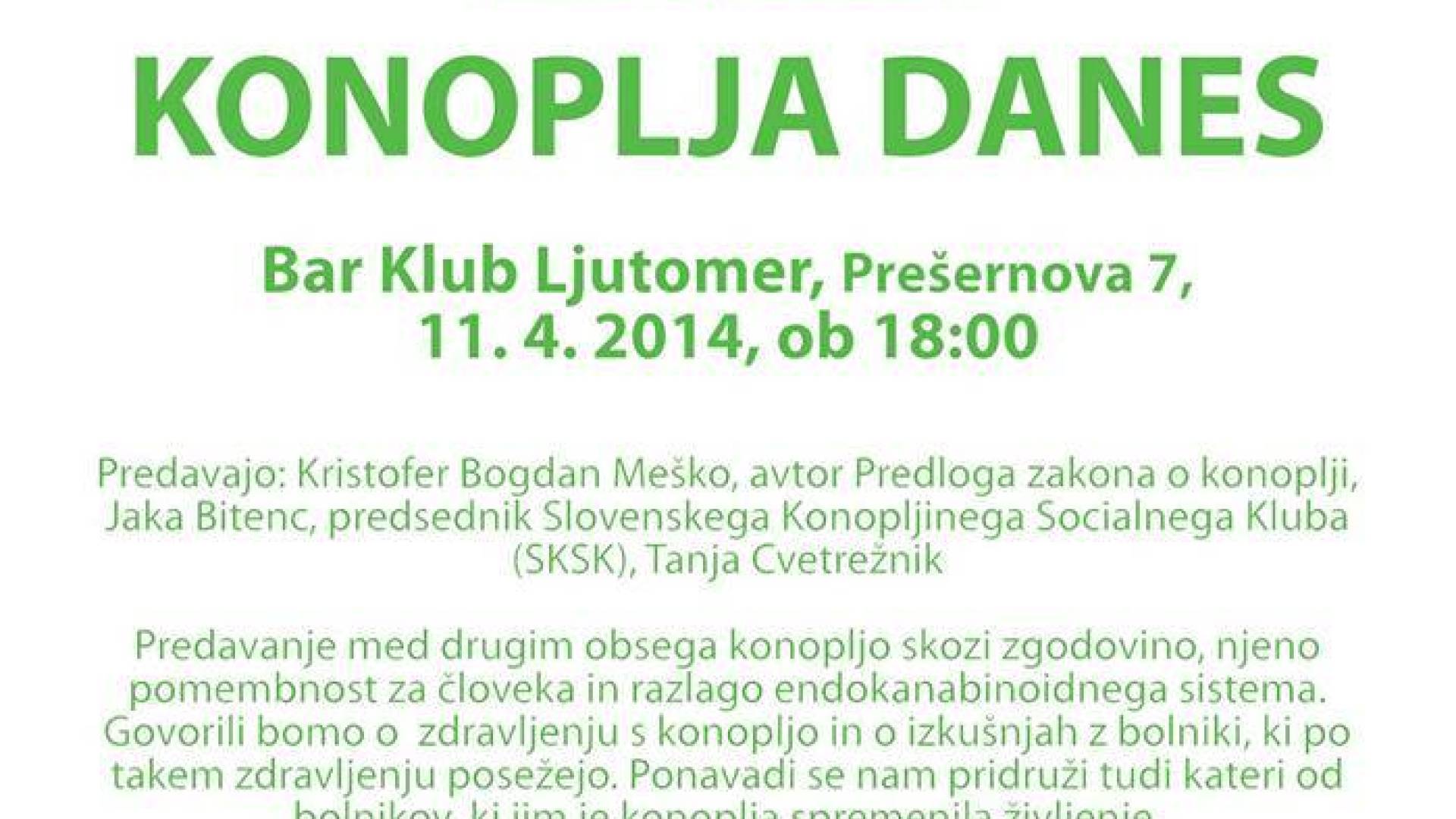 Bar Klub Ljutomer Prešernova 7Predavajo: Kristofer Bogdan Meško, avtor Predloga zakona o konoplji, Jaka Bitenc, predsednik Slovenskega Konopljinega Socialnega Kluba (SKSK), Tanja Cvetrežnik.
