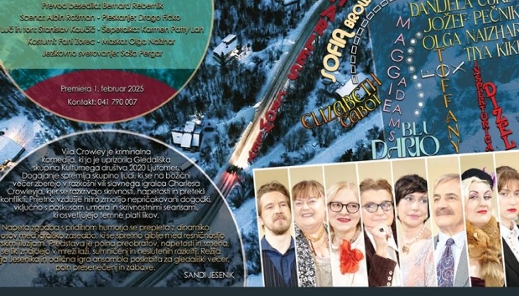 Dom kulture Gornja Radgona Partizanska cesta 11Vila Crowley je kriminalna komedija, ki se odvija v razkošni vili slavnega igralca Charlesa Crowleyja na božični večer. Zgodba prepleta elemente napetega kriminalnega zapleta in igrive komedije, ko se med povabljenimi začnejo razkrivati skrivnosti in napetosti, ki vodijo do nepričakovanih dogodkov – od skrivnostnega streljanja, umora odrskega vratarja Johna do iskanja resnice skozi seanso. Predstava spretno izpostavi dinamiko odnosov, polnih pretvarjanja, strasti in medsebojnega rivalstva.